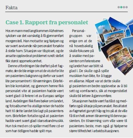 I den andre casen gir samtalen med ektefellen informasjon om ferier i Syden samt hvilken musikksmak pasienten har. På bakgrunn av disse opplysningene kan vi gjennomføre individuelt tilpassete tiltak som også styrker hans identitet og selvfølelse.