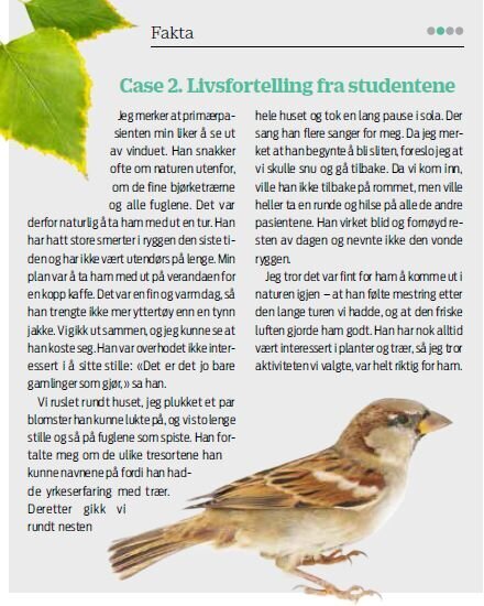 I den ene casen kommer det fram at pasienten har arbeidet i skogen. Det å komme i nærkontakt med naturen styrker identiteten og selvfølelsen hans og minsker oppmerksomheten på ryggsmerterene.