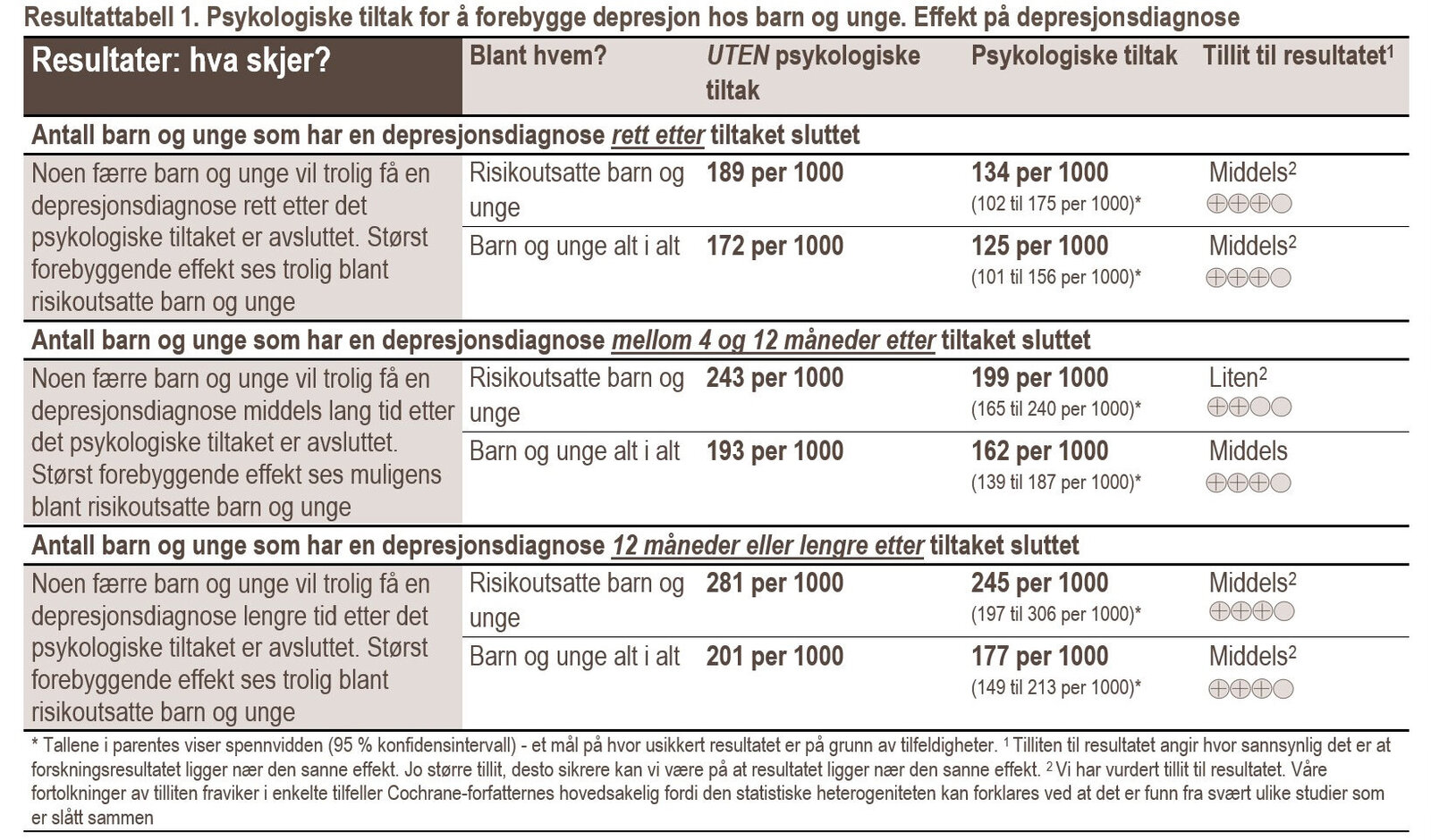 - muligens fører til at barn og unge får færre symptomer på depresjon rett etter at tiltaket er avsluttet (middels tillit til resultatet),