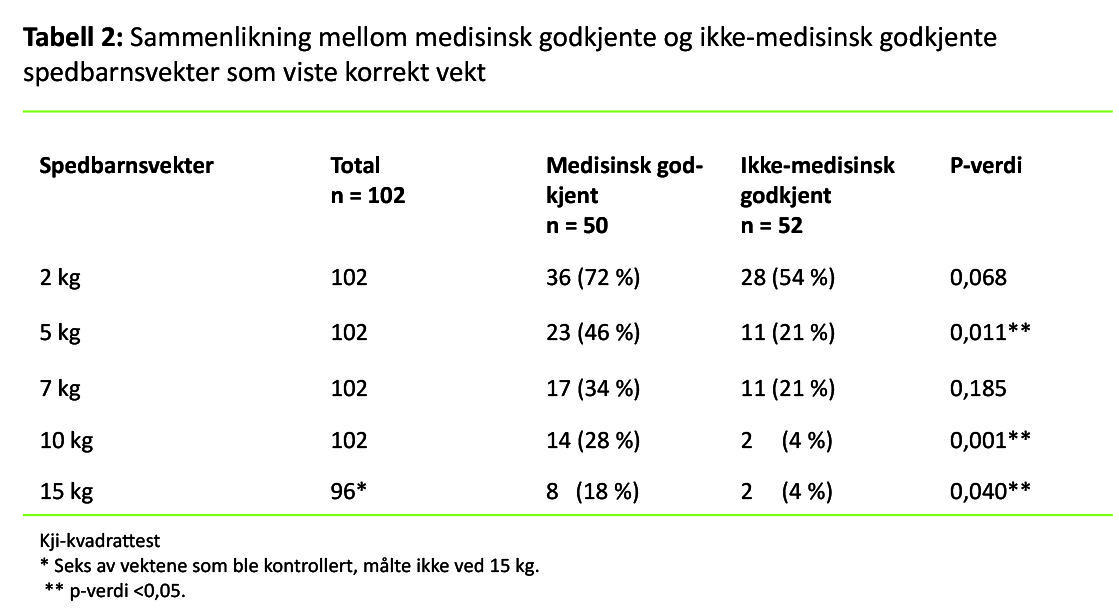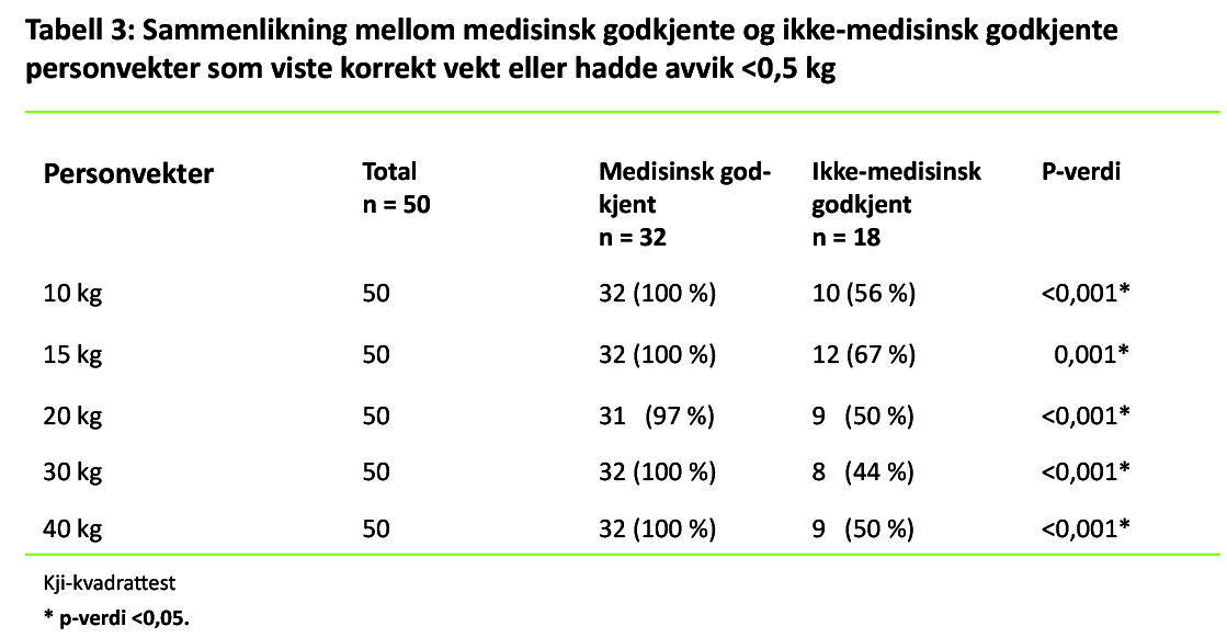 Det var 82 av vektene som var medisinsk godkjente, derav 50 spedbarnsvekter (n = 102) og 32 personvekter (n = 50). Alle de stasjonære spedbarnsvektene var medisinsk godkjente. Mange av de flyttbare spedbarnsvektene som ble brukt ved hjemmebesøk, var ikke-medisinsk godkjente. De medisinsk godkjente vektene var signifikant mer nøyaktige ved de fleste målingene enn de ikke-medisinsk godkjente vektene (tabell 2 og tabell 3). Halvparten av de ikke-medisinsk godkjente personvektene hadde avvik på 0,5 kilo eller mer, mens kun én av de medisinsk godkjente personvektene hadde et avvik på 0,5 kilo (tabell 3). De medisinsk godkjente vektene var også bedre på repeterbarhet og stabilitet.