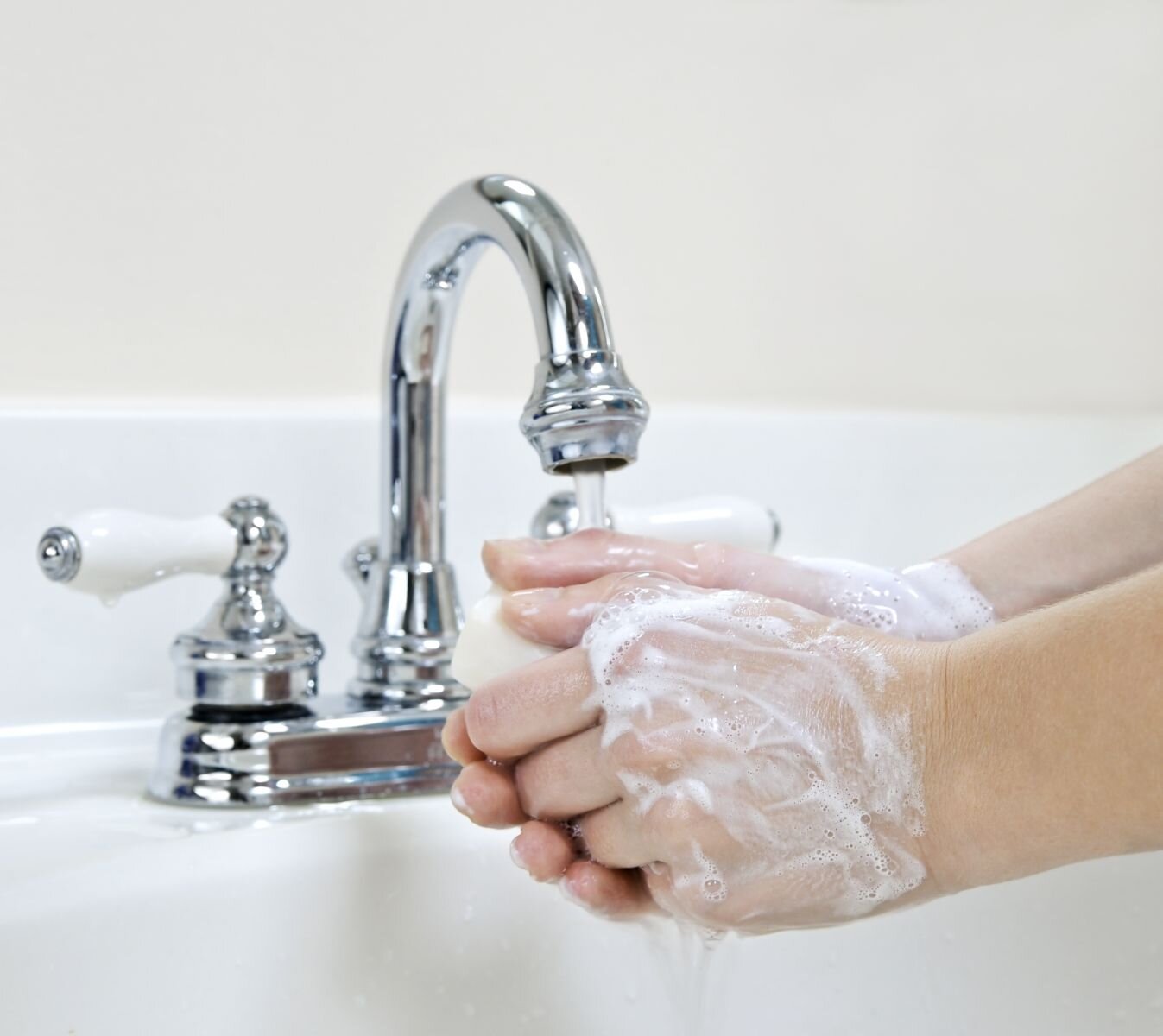 Bildet viser et par hender innsmurt av såpe, som vaskes i springen