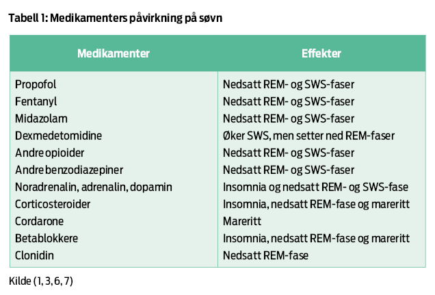 Flere typer medikamenter som blir brukt til intensivpasienter undertrykker SWS og REM-søvn. Pasienter som sover i lett søvn, er ekstra utsatte for søvnforstyrrelser. Pasienter som er dypt sedert eller i komatøs tilstand blir ofte omtalt som å være i dyp søvn. Til tross for at de ikke kan vekkes, produserer de likevel ikke en slik kompleks hjerneaktivitet som vi ser under normal søvn. I stedet er hjernebølgene veldig sakte, svake og asynkrone (2, 6).
