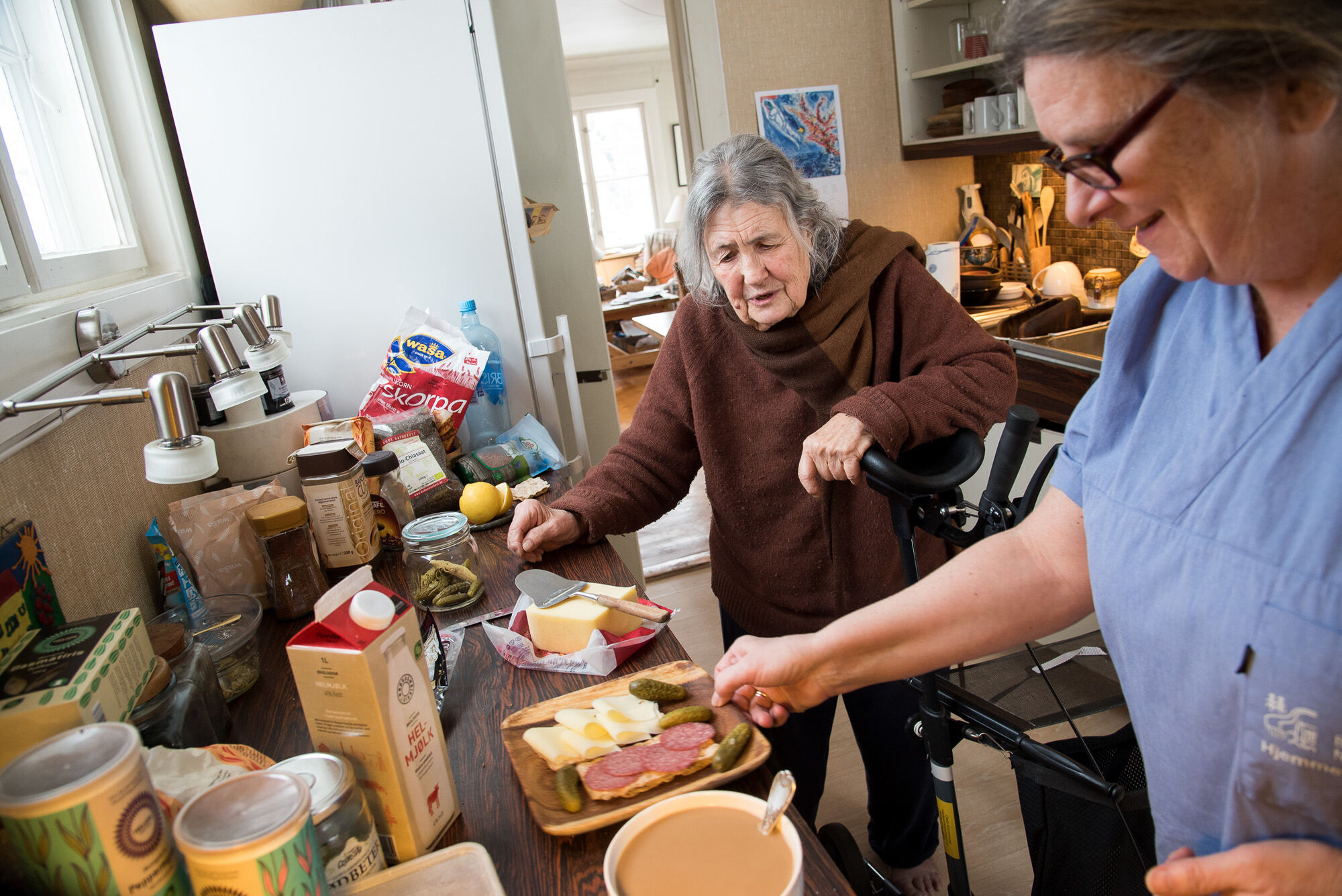 Bildet viser en hjemmesykepleier som tilbereder et måltid til brukeren.