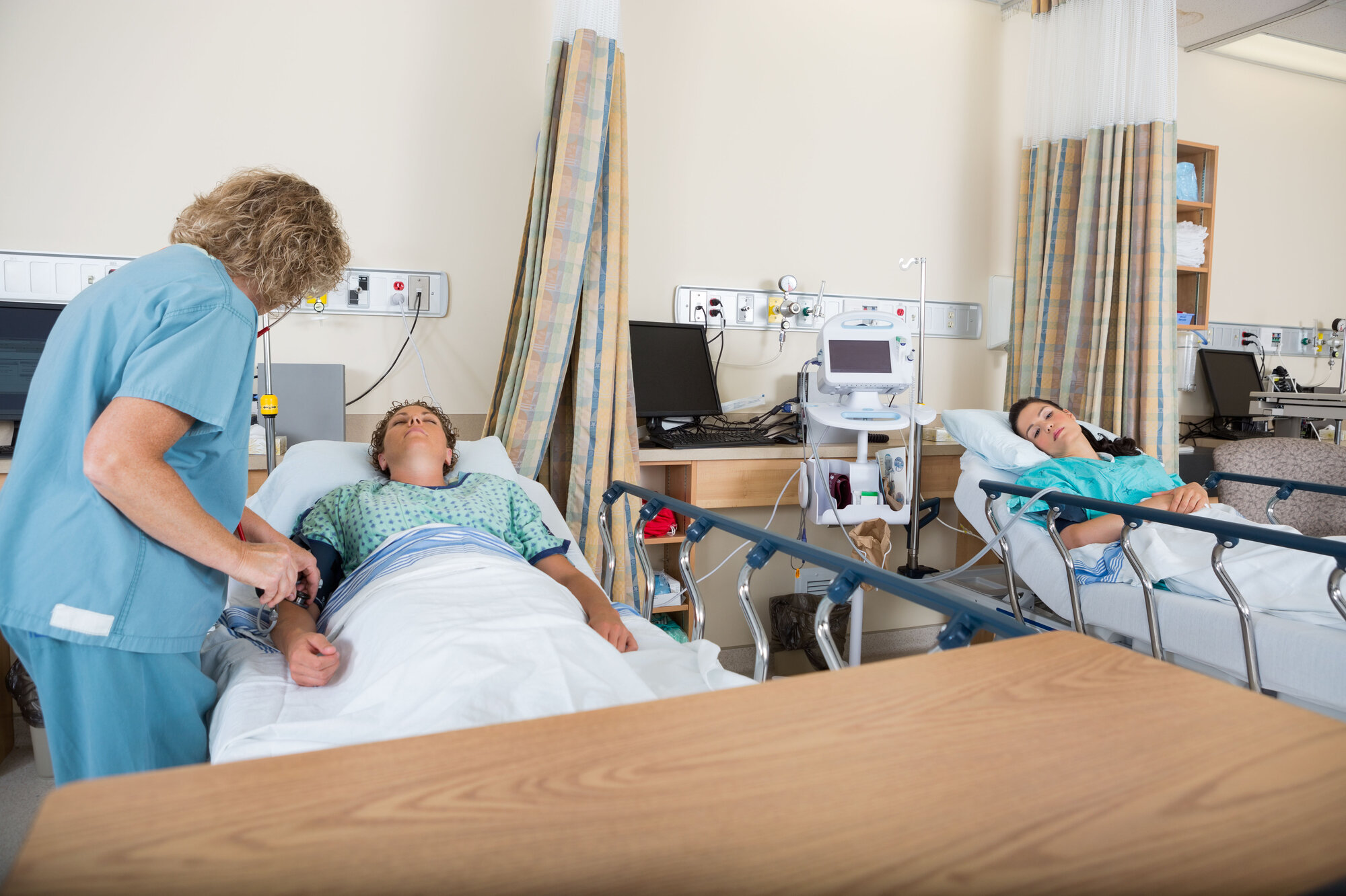 En sykepleier undersøker en pasient på sengepost. En annen pasient ligger i sengen ved siden av.