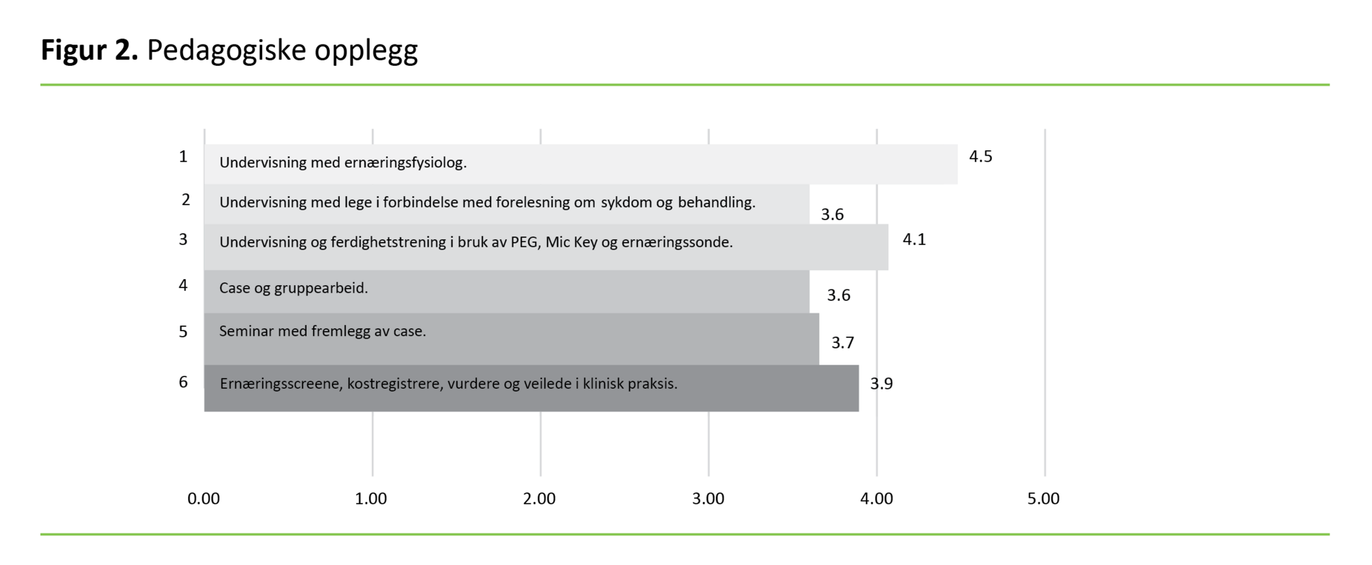 Læringsutbyttet «kartlegging av pasientenes ernæringsstatus samt å undervise og veilede pasient og pårørende» som korresponderer med dette opplegget, får god score. Det innebærer at opplegget har bidratt til å utvikle ernæringskompetanse. I fritekst fremkommer det et ønske om større fokus på ernæringsveiledning, noe som synliggjør et behov det pedagogiske opplegget er ment å imøtekomme.