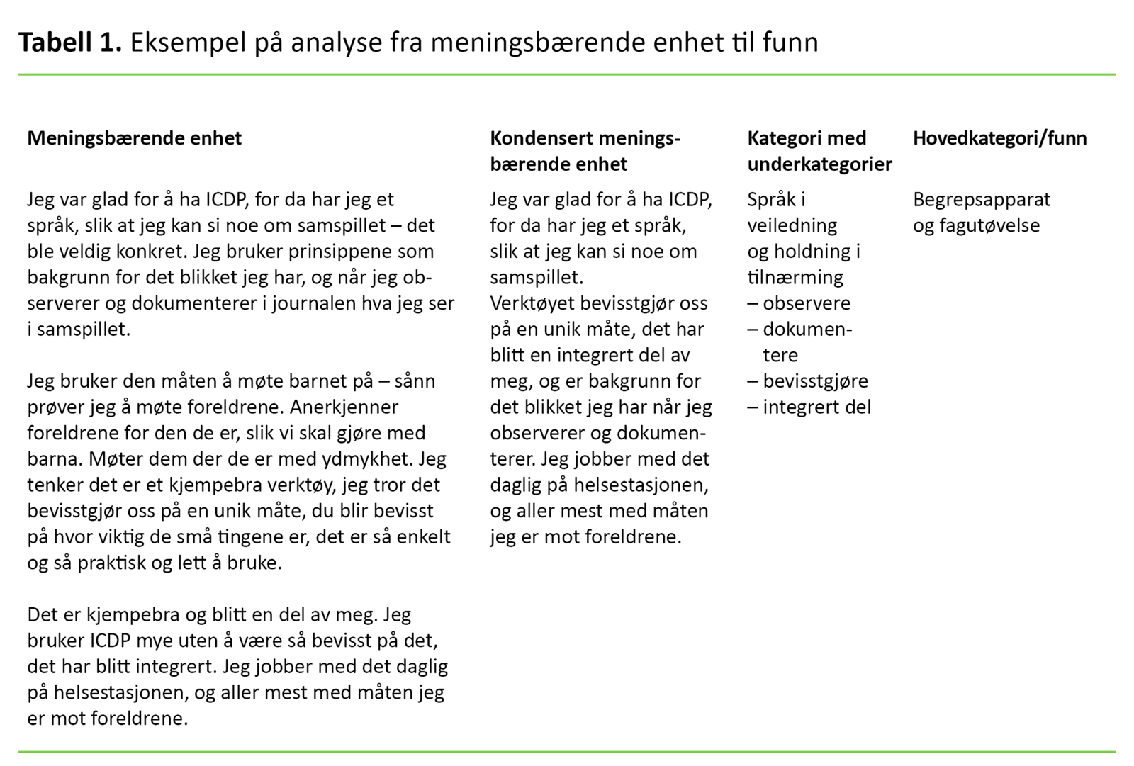 Førsteforfatteren analyserte teksten i en firetrinnsprosedyre ved hjelp av systematisk tekstkondensering med en fortolkende tilnærming (18) (tabell 1). I første trinn leste førsteforfatteren materialet gjentatte ganger og noterte refleksjoner før hun skrev ned helhetsinntrykket og identifiserte foreløpige temaer.