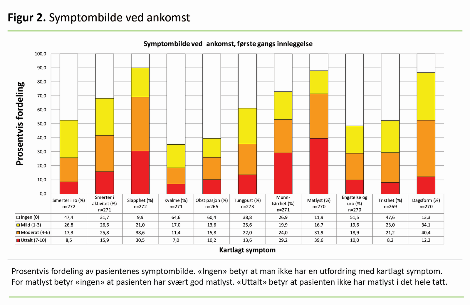 I figur 2 presenterer vi symptomene dikotomisert i kategoriene «ingen» (skår 0), «mild» (skår 1–3), «moderat» (skår 4–6) og «uttalt» (skår 7–10). Slapphet, munntørrhet, nedsatt matlyst og dagsform («alt i alt hvordan har du det i dag?») er symptomer der over 50 prosent av pasientene har avgitt en skår mellom 4 og 10. Størst andel av «uttalt symptom» finner vi for matlyst (skår 7–10).