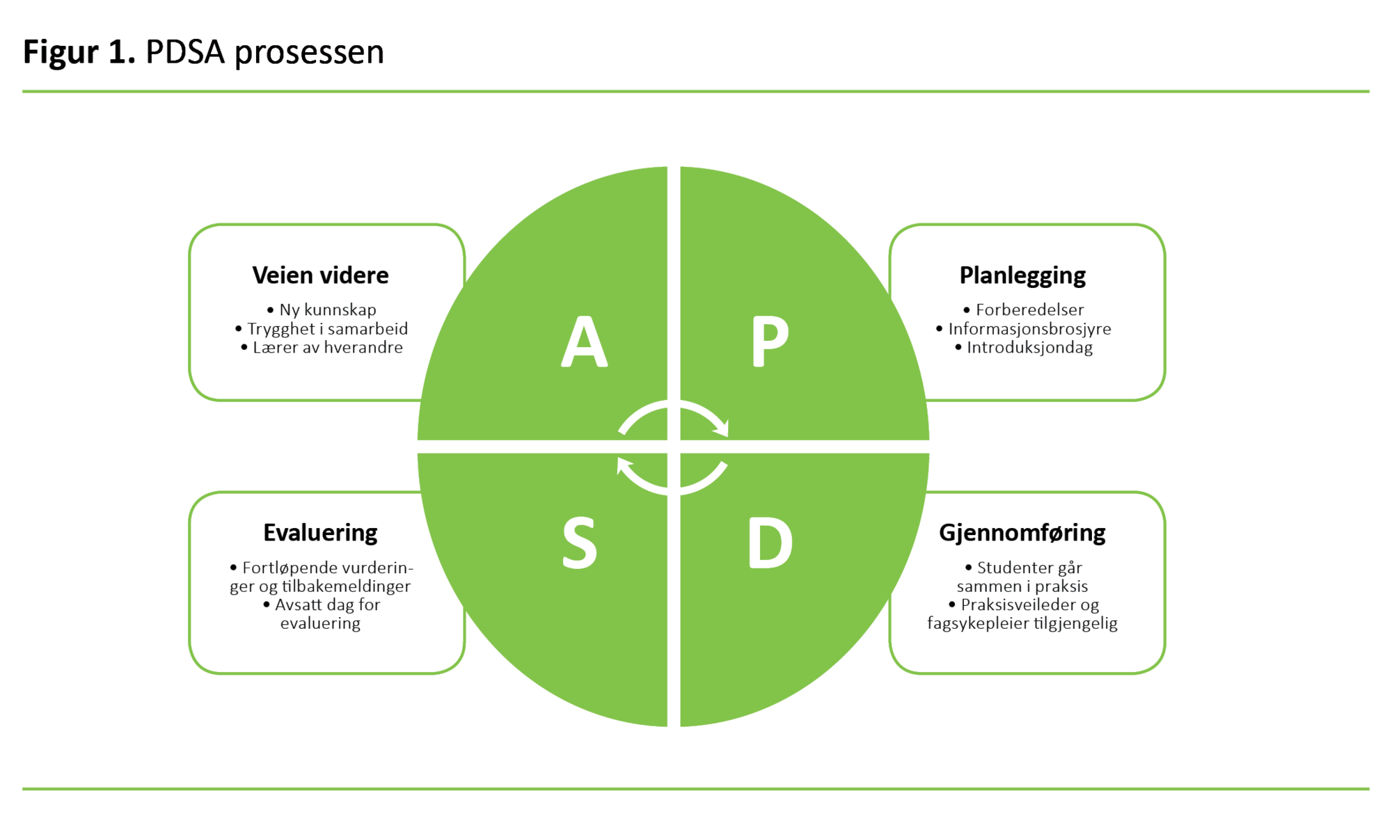 I prosessen med utviklingen av det tverrprofesjonelle samarbeidsprosjektet har vi benyttet trinnene i kvalitetshjulet: plan, do, study og act som bygger på Demings sirkel,også navngitt som PDSA-sirkel (PUKK-sirkel på norsk) (14). Modellen er videreutviklet av kunnskapssenteret og viser til en sirkel med de fem fasene: forberede, planlegge, utføre, evaluere/vurdere og følge opp. Sirkelen viser en kontinuerlig prosess i systematisk forbedringsarbeid (15). Vi har i vårt tverrprofesjonelle prosjekt brukt en modifisert modell som viser trinnene vi har gjennomført (figur 1).