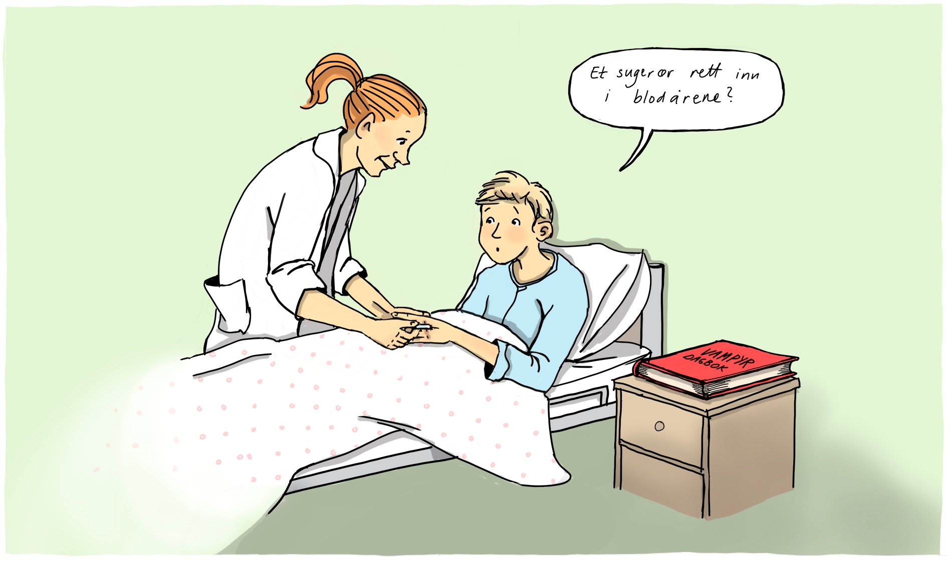 Illustrasjonen viser en gutt i en sykeseng som sier til sykepleieren: "Et sugerør rett inn i blodårene?"