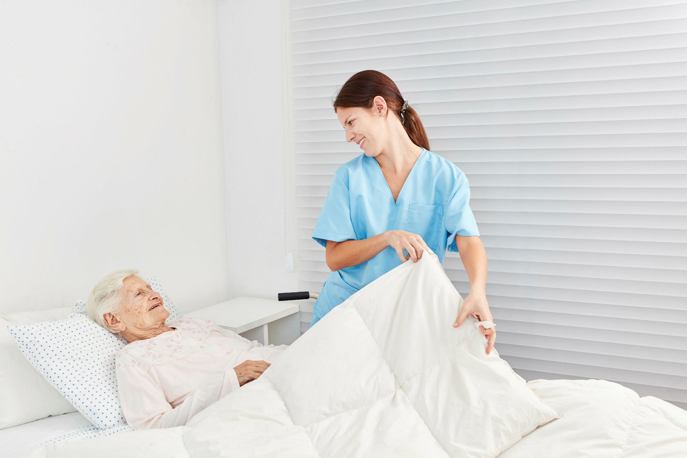Bildet viser en sykepleier som steller for en syk pasient.