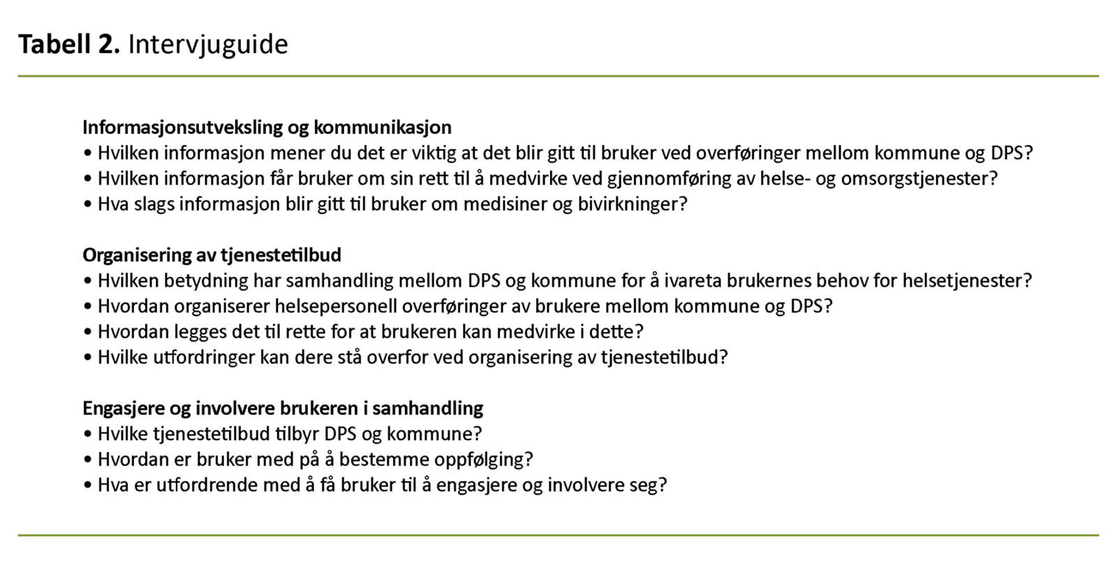 Intervjuene foregikk på deltakernes arbeidsplass høsten 2017 og ble gjennomført av førsteforfatteren. Vi brukte en semistrukturert intervjuguide (20) (tabell 2).