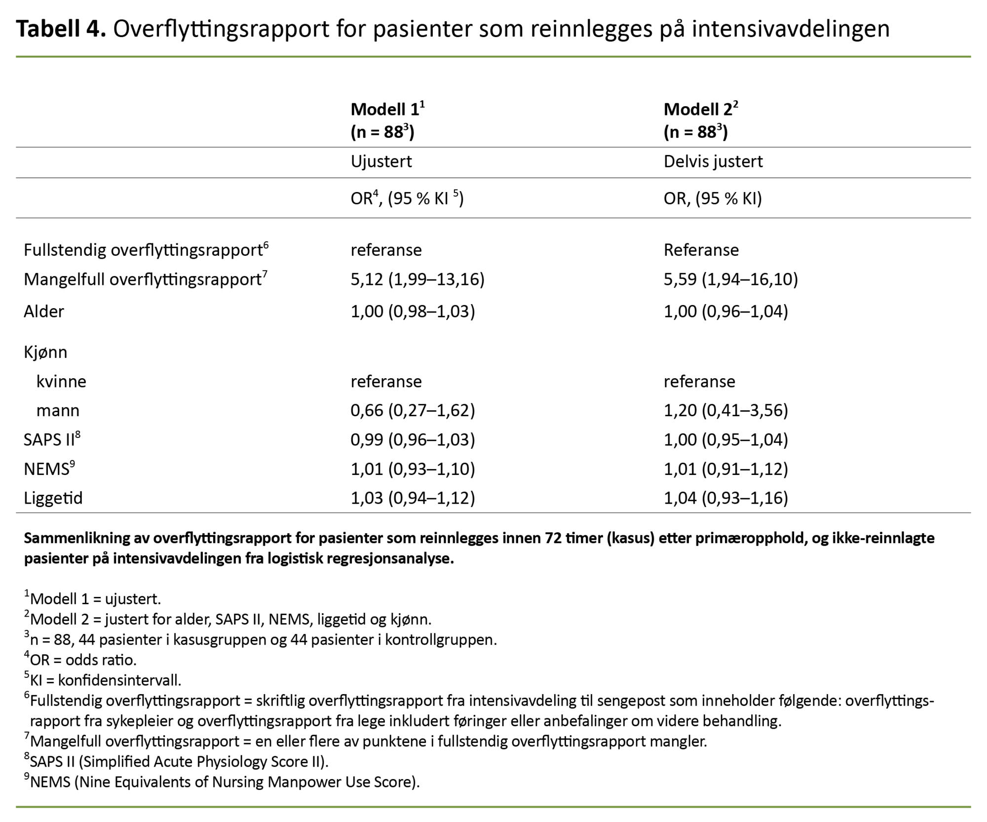 Denne studien viser at pasienter som ble reinnlagt innen 72 timer, hadde hele fem ganger høyere odds (OR = 5,1, p < 0,001) for å ha mangelfull overflyttingsrapport sammenliknet med pasienter som ikke reinnlegges (tabell 3).