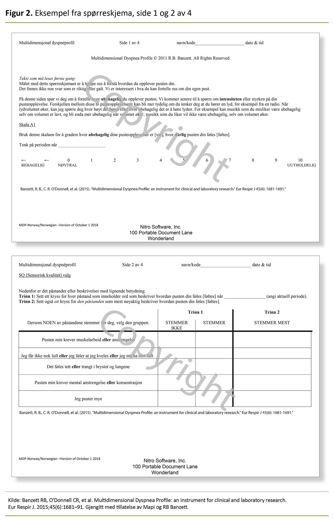 23.   Mapi Research Trust. Multidimensional Dyspnea Profile (MDP). Lyon: Mapi Research Trust; 2020. Tilgjengelig fra: https://eprovide.mapi-trust.org/instruments/multidimensional-dyspnea-profile (nedlastet 29.05.2020).