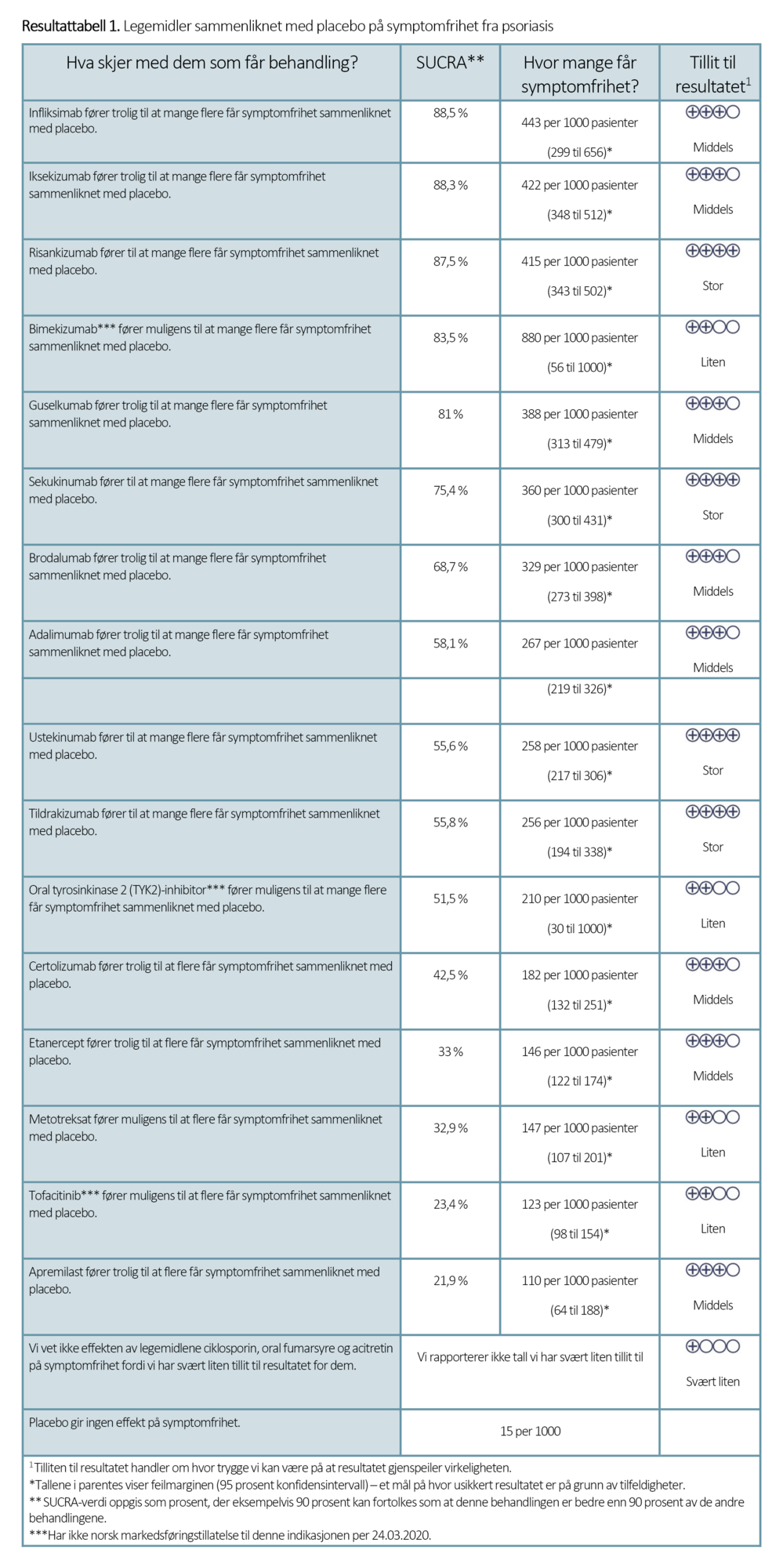 - alle legemidlene gir økt symptomfrihet fra psoriasis sammenliknet med placebo