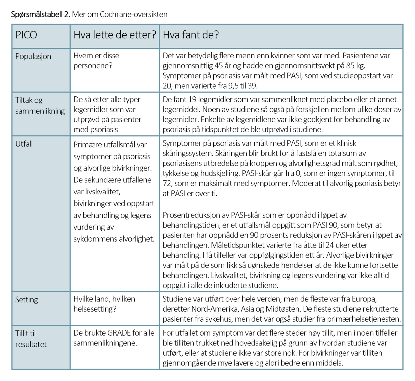 I systematiske oversikter samles og vurderes tilgjengelig forskning. I denne systematiske Cochrane-oversikten var spørsmålet følgende: «Hva er effekten av legemidler sammenliknet med placebo hos personer som har moderat til alvorlig plakkpsoriasis?»