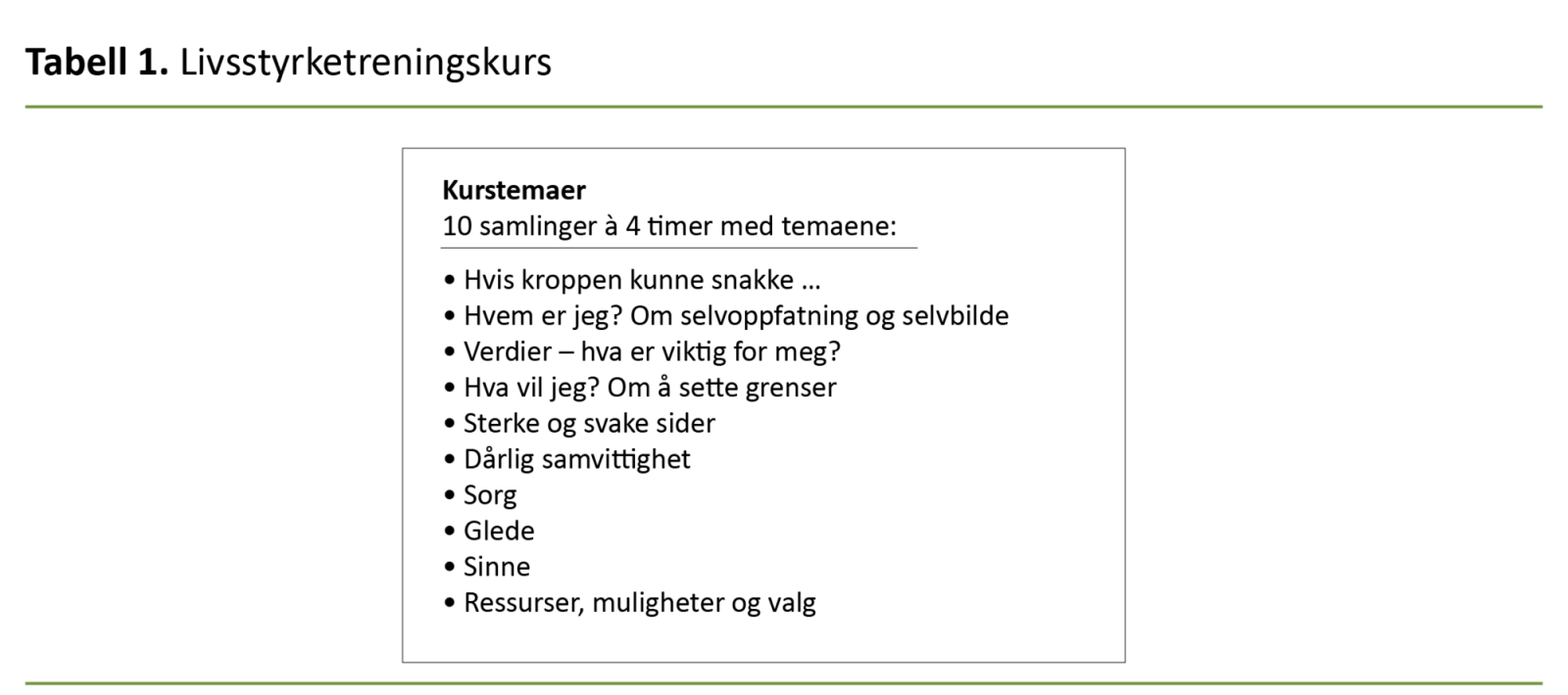 Det jobbes med selvforståelse, og kurset er bygget opp rundt «livstemaer» som kan berøres av å leve med helseplager (tabell 1) (13, 14). Sammenhenger mellom tanker, følelser og kropp samt en anerkjennelse av personen som ekspert på seg selv ligger til grunn (14). LST-kursledere er sertifisert gjennom en videreutdanning (15).