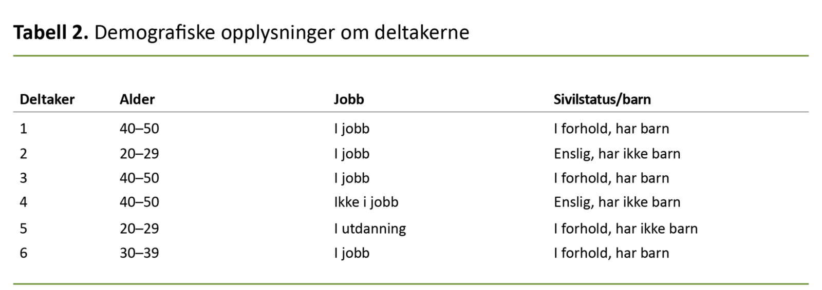 På grunn av lav respons valgte vi å inkludere ytterligere én person med fibromyalgi som hadde deltatt på LST-kurs utenfor SALSA-studien (tabell 2). Etter intervjuene erfarte vi at de samme temaene ble gjentatt, og at vi hadde fått et rikt datamateriale, og valgte å avslutte rekrutteringen.