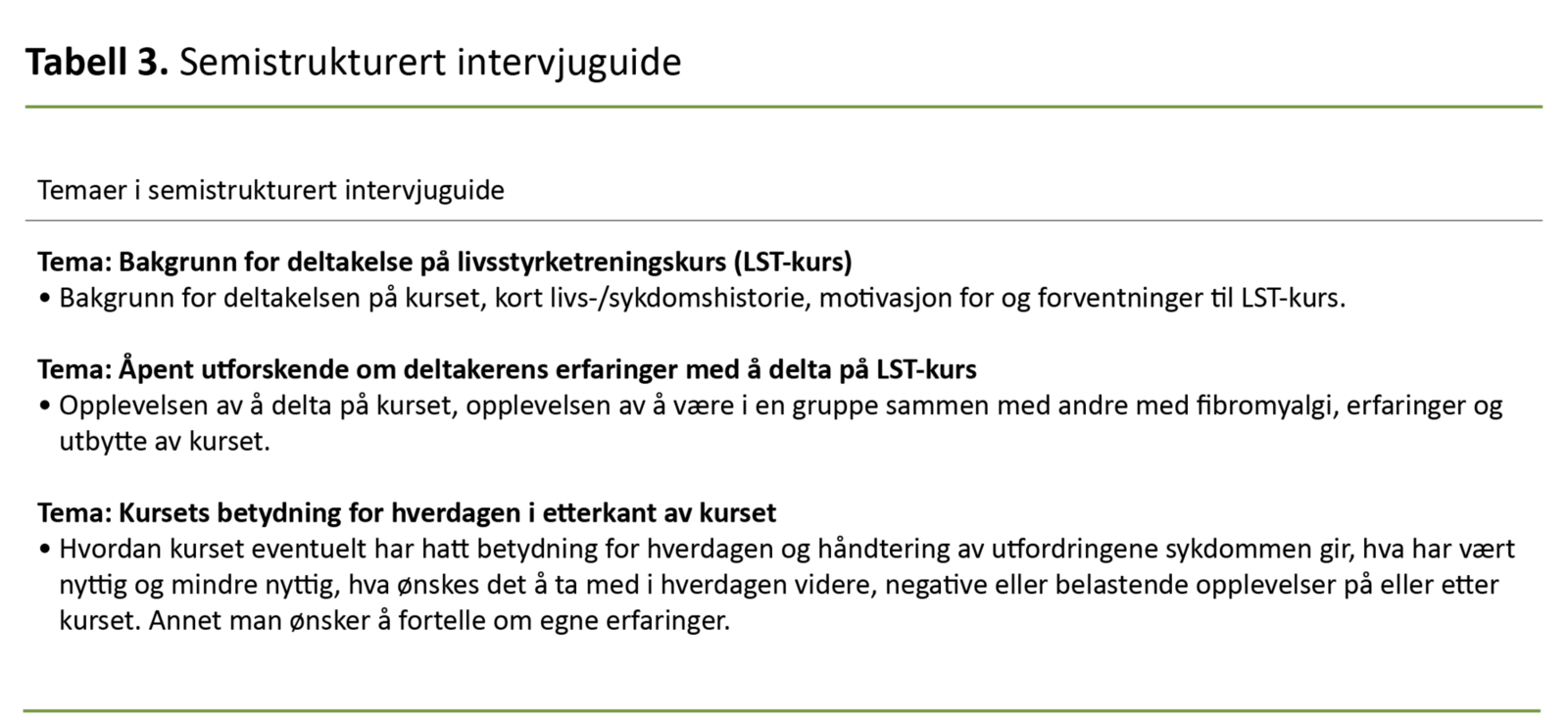 Fordi vi ønsket kunnskap om betydningen LST-kurset hadde etter at det var avsluttet, valgte vi å gjennomføre intervjuene tre–fire måneder etter kursslutt. I starten av intervjuet fikk deltakerne informasjon om prosjektet, hensikten med intervjuet og intervjuerens bakgrunn. Vi informerte også om at kritiske betraktninger var betydningsfulle. Vi utviklet en semistrukturert intervjuguide med søkelyset på deltakernes erfaringer, opplevelser og refleksjoner (tabell 3).