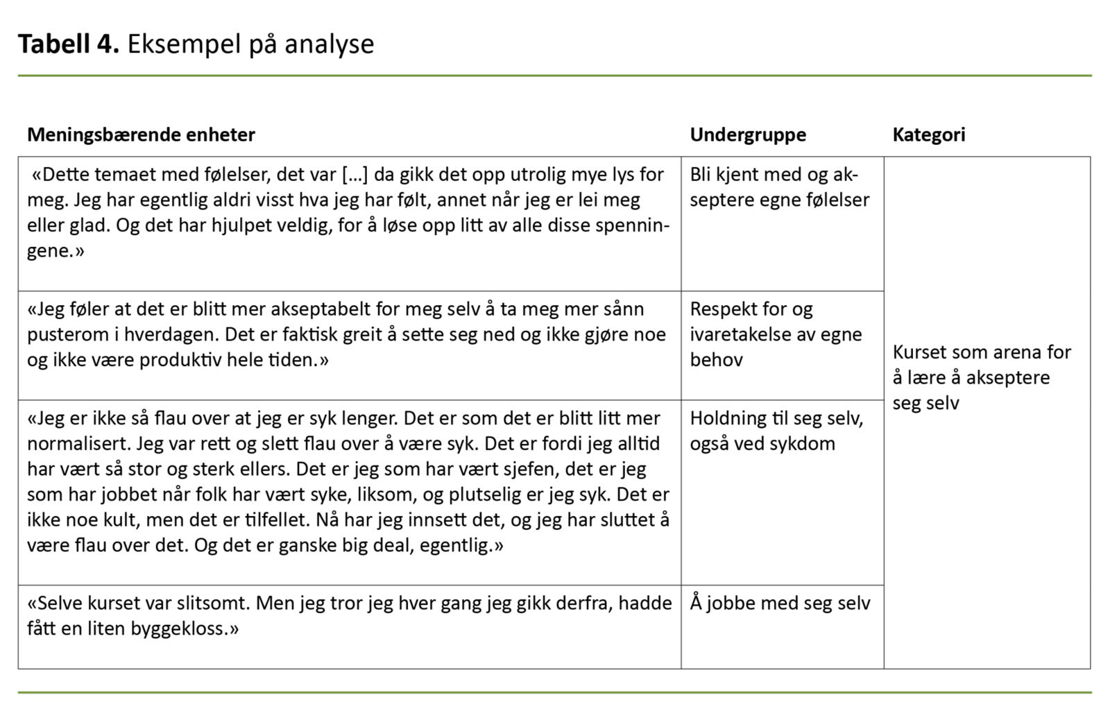 Analyseprosessen resulterte i tre hovedkategorier: 1) Å forstå seg selv i lys av gruppen, 2) Kurset som arena for å lære å akseptere seg selv, og 3) Håndtering av hverdagens utfordringer.