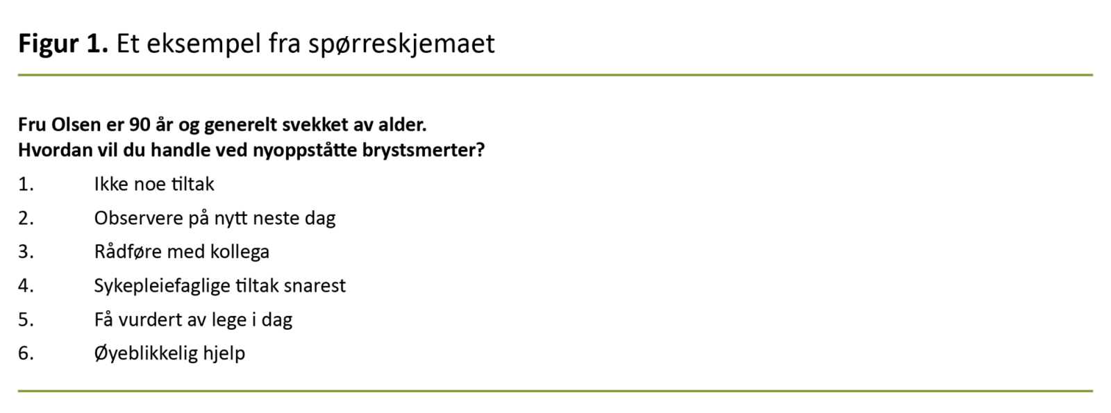 Spørsmålene i spørreskjemaet har til hensikt å samle inn statistiske målbare data på hvilke vurderinger helsepersonellet gjør når sykdom oppstår: «Hva vil du gjøre når skrøpelige fru Olsen på 90 år får nye symptomer på sykdom …?». Deltakerne velger ett av seks svaralternativer (figur 1).