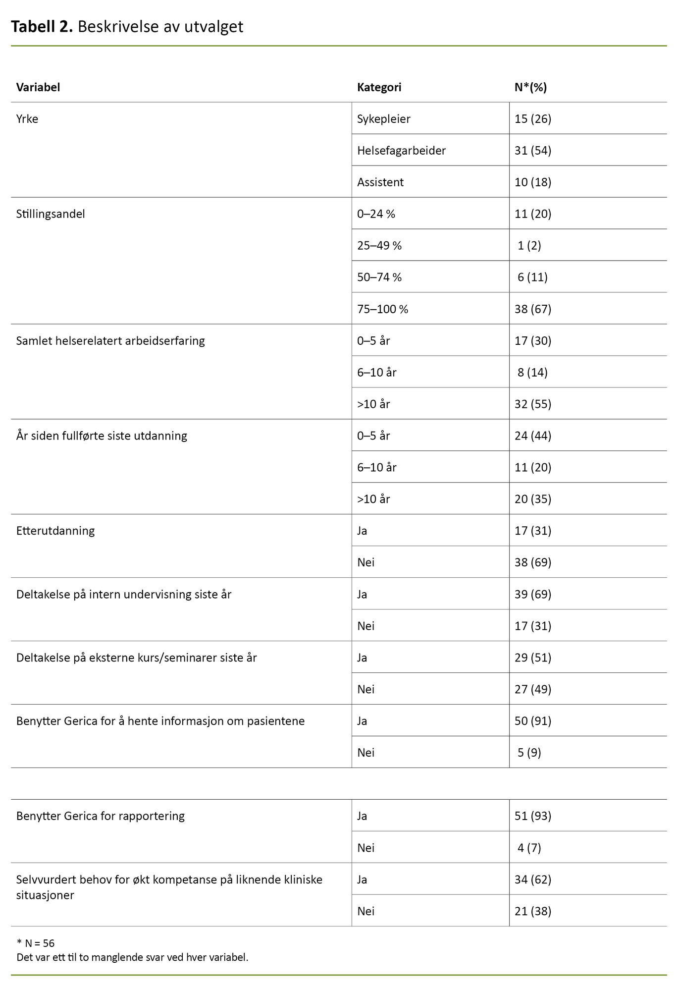 Undersøkelsen fikk en svarprosent på 51. Utvalget (N = 56) besto av helsefagarbeidere (n = 31), sykepleiere (n = 15) og assistenter (n = 10) (tabell 2). En person uten oppgitt yrkesbakgrunn ble ekskludert fra studien. Utvalget representerte 79 prosent av sykepleierne, 55 prosent av helsefagarbeiderne og 29 prosent av assistentene på sykehjemmet.