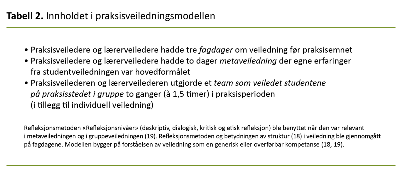 Resultat: Analysen resulterte i tre hovedkategorier: 1) utvikling av kompetanse knyttet til refleksjon, struktur, metode og ledelse i veiledning, 2) utvikling av samarbeid gjennom felles faglig plattform for veiledning, gjensidig respekt og forståelse for hverandres kompetanse og bidrag, og 3) praksismodellen bidro til læring og bevisstgjøring gjennom refleksjon og øving i fellesskap over tid med kombinasjon av teori og praksis