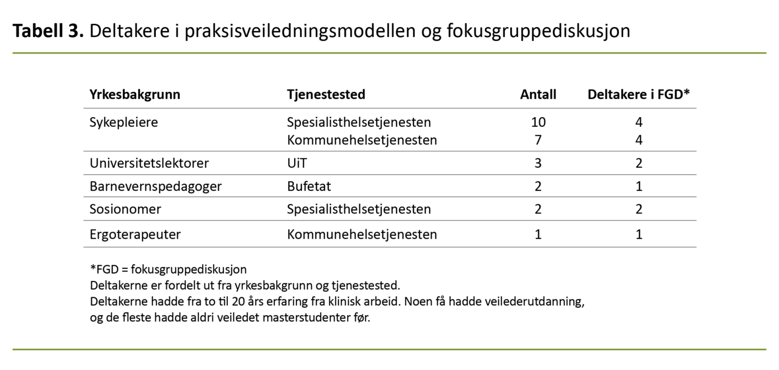 Alle deltakerne i praksisveiledningsmodellen (praksisveiledere og lærerveiledere) ble invitert til fokusgruppediskusjonene. Praksisveilederne representerte spesialist- og kommunehelsetjenesten og utgjorde to fokusgrupper. I tillegg utgjorde studentene én fokusgruppe, siden de var sluttbrukere.
