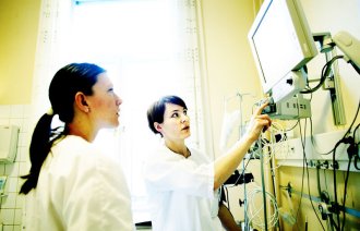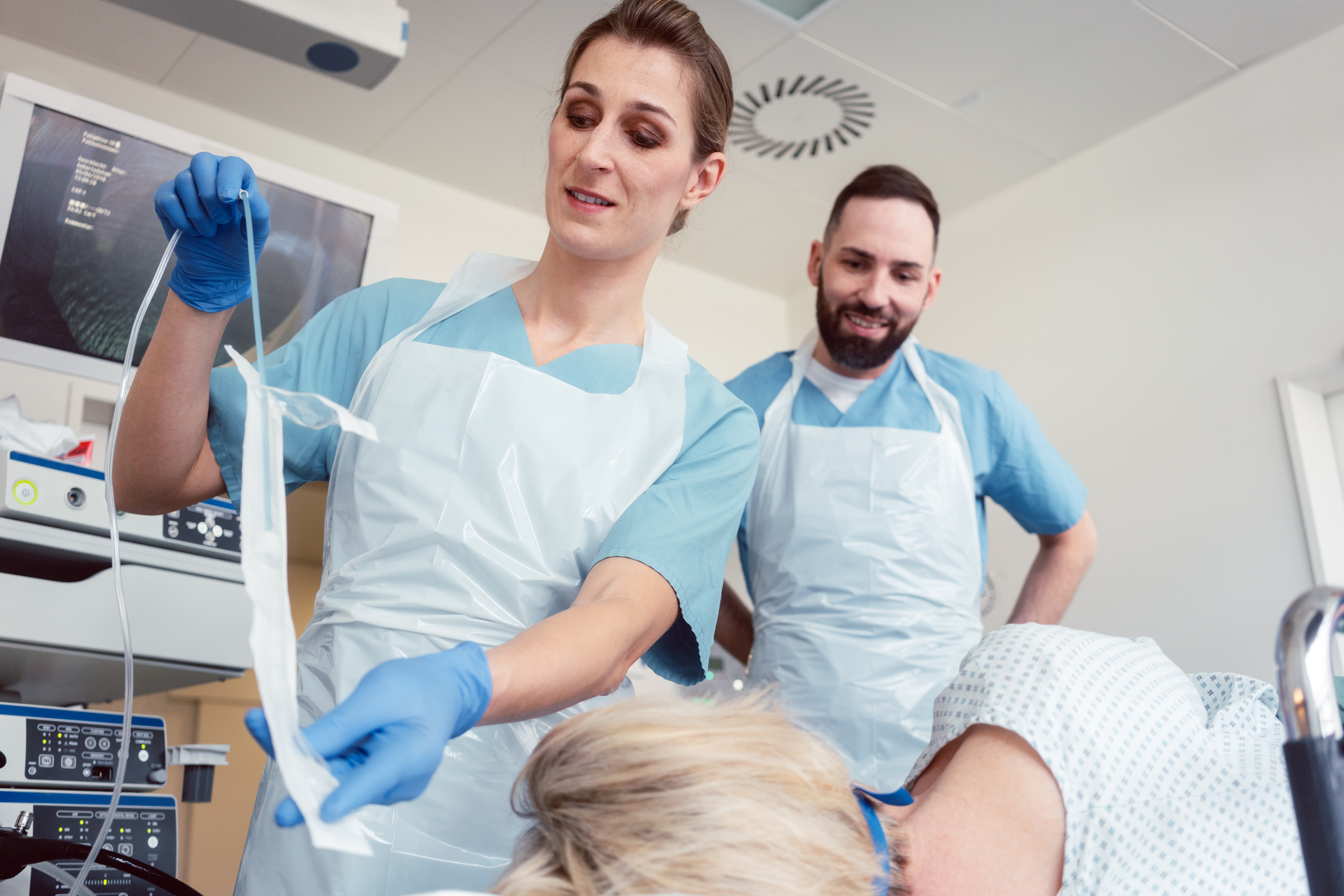 Bildet viser to sykepleiere som pakker ut en gastroskopitube.