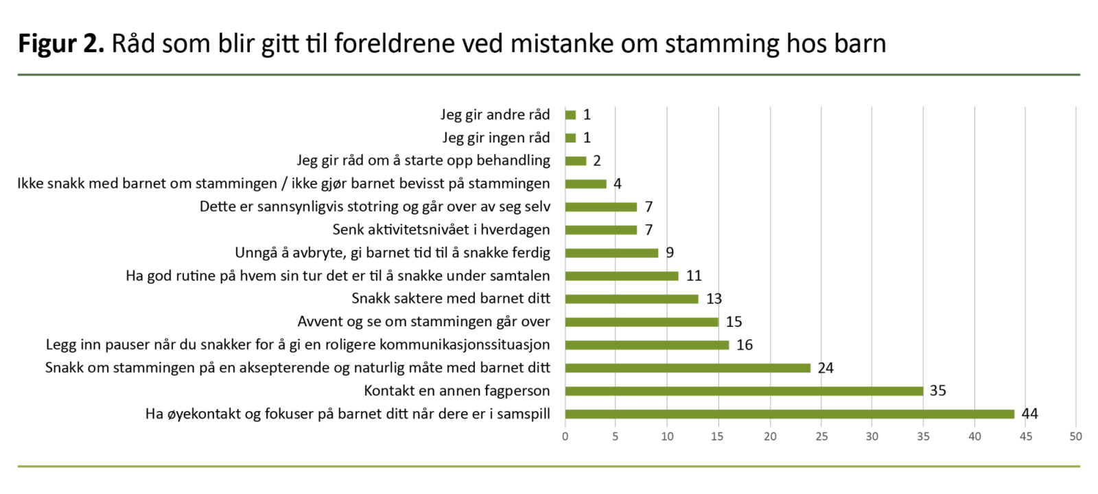 De hyppigste rådene helsesykepleierne ga til foreldre med barn som stammer, var å ha øyekontakt ned barnet i samspill, snakke om stamming på en aksepterende og naturlig måte samt kontakte en fagperson. Figur 2 viser rådene som ble gitt i møte med foreldrene.