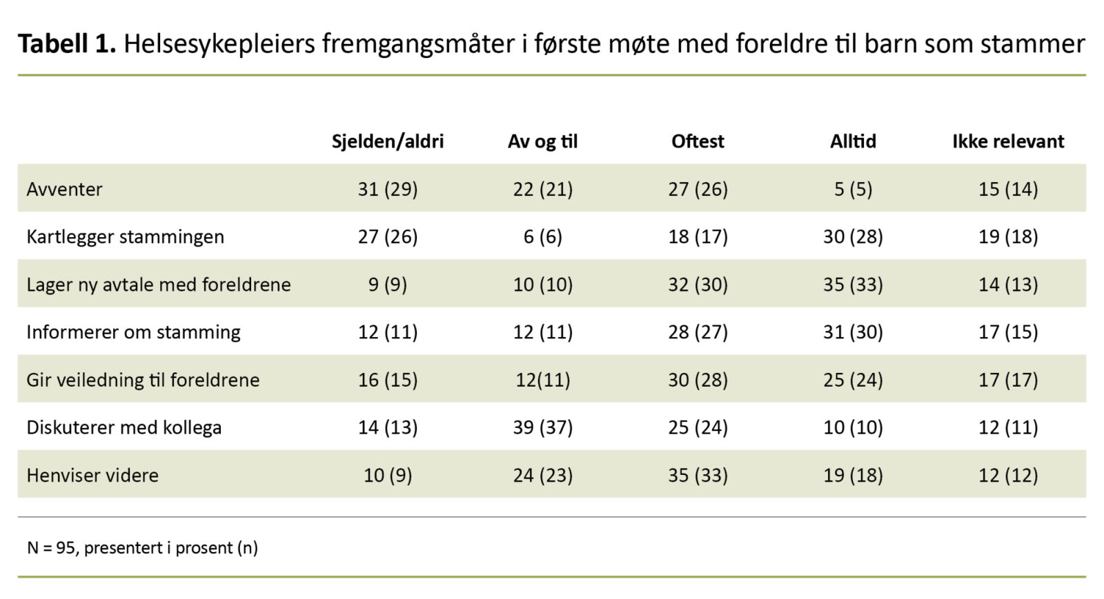 Helsesykepleiernes fremgangsmåte i det første møtet med foreldre og barn var å informere om stamming og lage nye avtaler med foreldrene. Tabell 1 viser de ulike fremgangsmåtene som helsesykepleierne oppga i møte med barn som stammer.