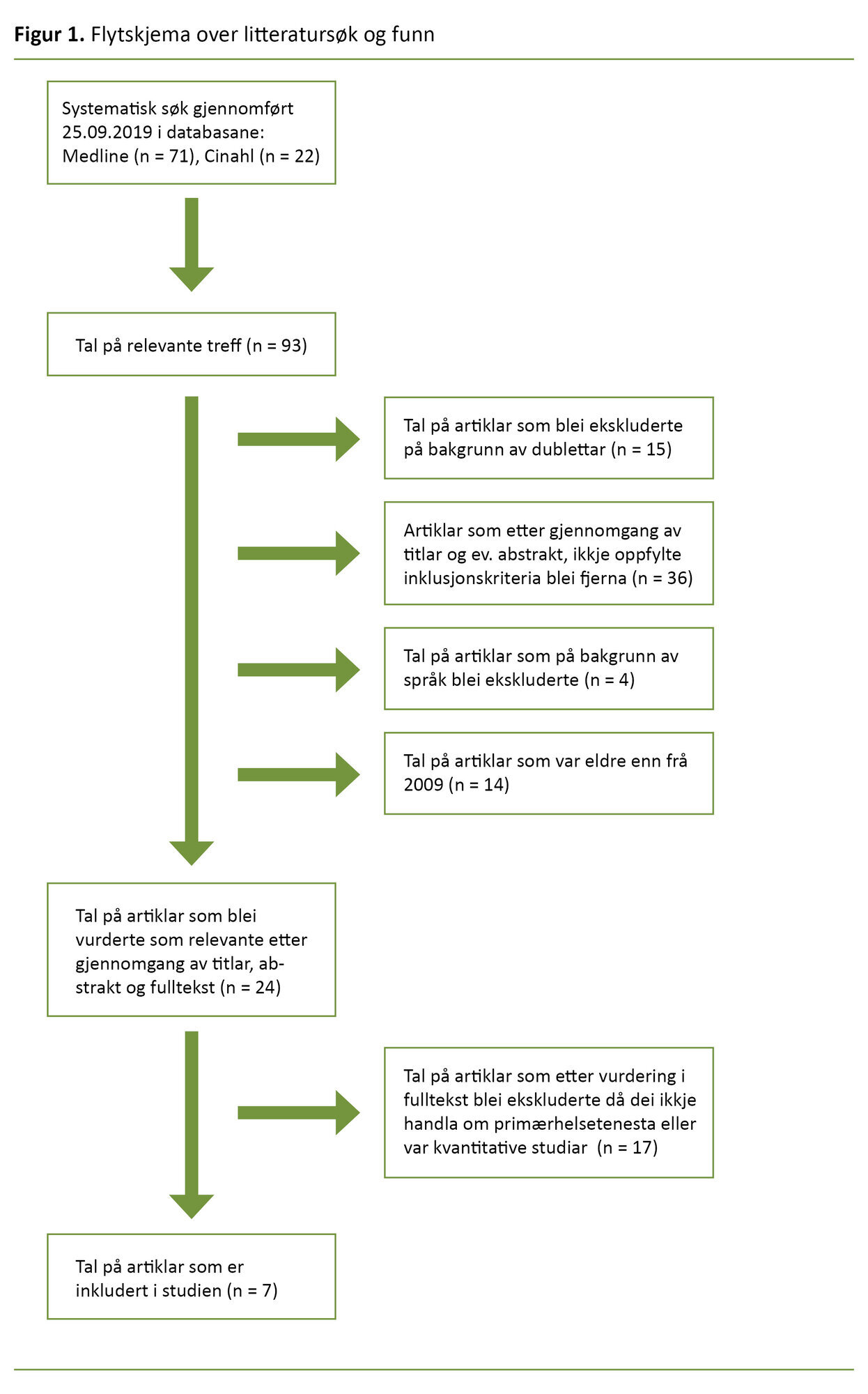 Søket i Medline enda opp med 71 artiklar og i Cinahl i 22 (vedlegg 2). Ved nærare gjennomgang av tittel og abstrakt i dei 93 artiklane blei 36 fjerna fordi dei ikkje handla om det valde temaet og den valde problemstillinga, og dermed ikkje oppfylte inklusjonskriteria (figur 1).