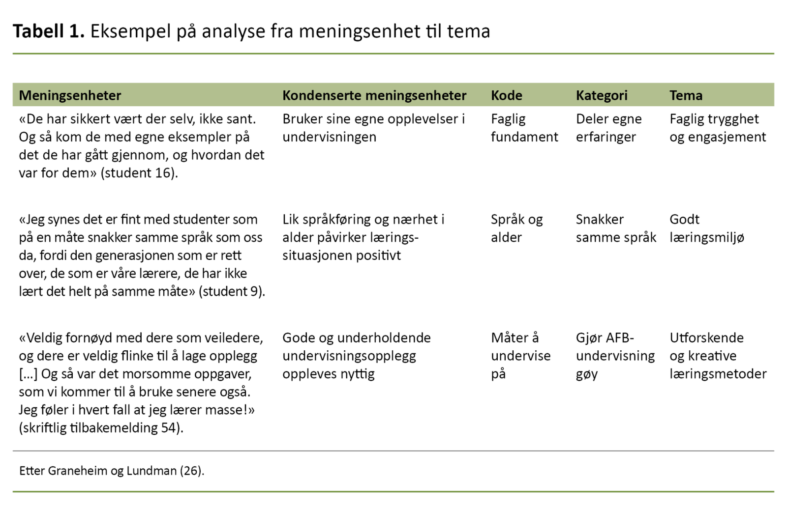 Vi arbeidet med koder, kategorier og tema og presenterte det deretter for hele forskergruppen. De kom med innspill, som vi brukte til å revidere analysen. Dette ble gjort i flere omganger frem til vi oppnådde konsensus. Tabell 1 viser en illustrasjon av analysearbeidet.