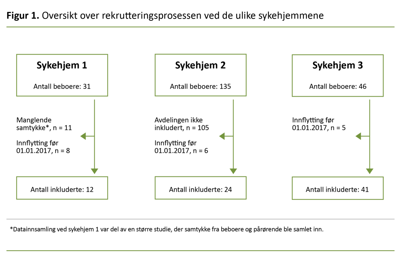 Ved sykehjem 2 inkluderte vi beboere ved to tilfeldig valgte avdelinger i studien. Av til sammen 30 beboere ved disse to avdelingene hadde 24 fått tildelt fast plass 1. januar 2017 eller senere og ble dermed inkludert i studien. Ved sykehjem 3 ble samtlige beboere som tilfredsstilte inklusjonskriteriene, inkludert (n = 41). Figur 1 viser en oversikt over utvalget.