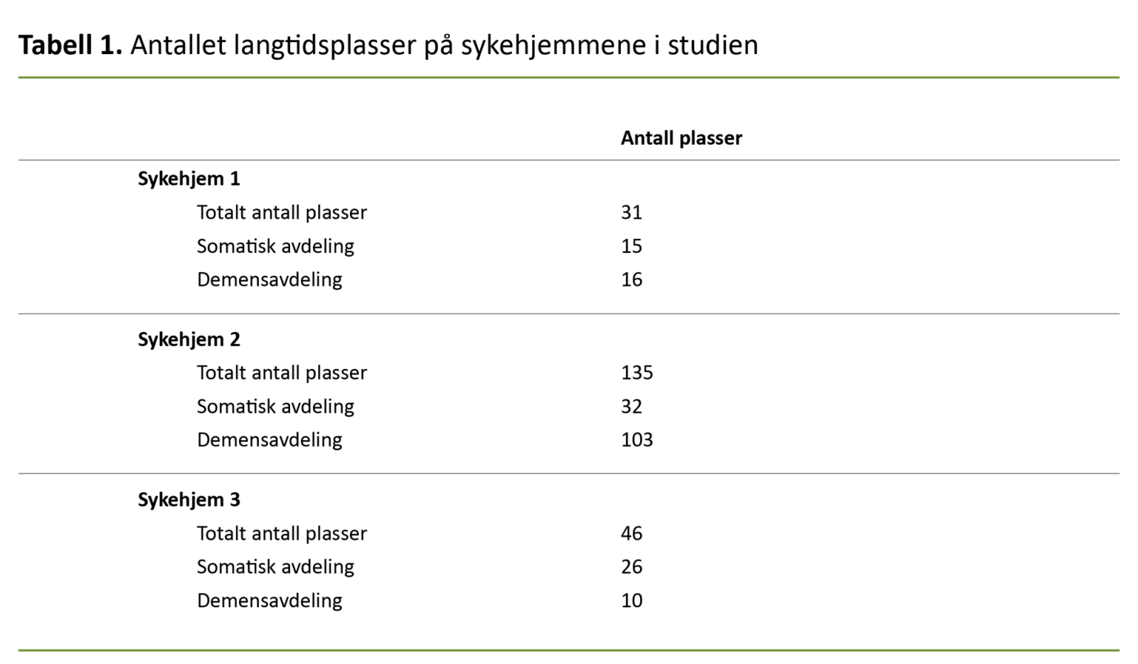 Vi gjennomførte en retrospektiv observasjonsstudie (21) på tre tilfeldig utvalgte sykehjem av ulik størrelse i Vestland fylke (tabell 1). Ved hvert av sykehjemmene inkluderte vi beboere etter følgende inklusjonskriterier: 1) beboer på et av de aktuelle sykehjemmene på tidspunktet vi hentet ut data, og 2) tildelt fast plass 1. januar 2017 eller senere.