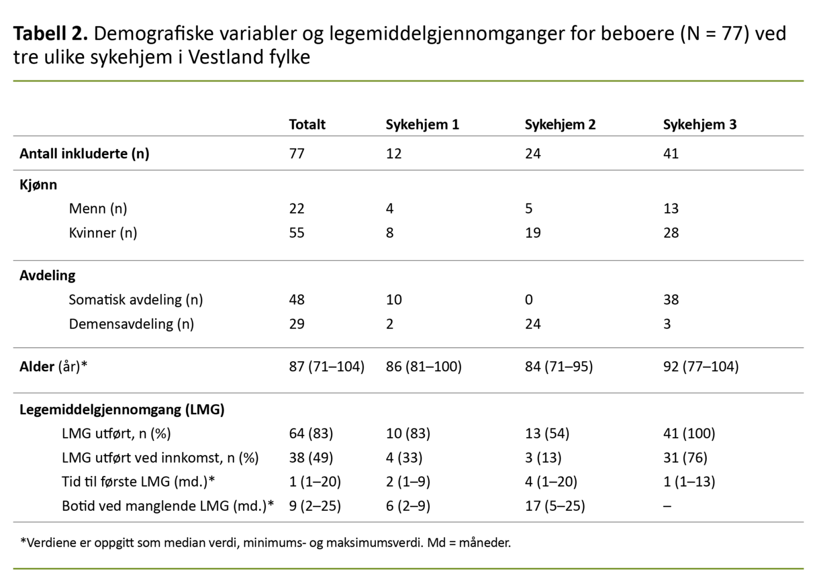 Totalt 77 beboere ble inkludert i studien (tabell 2). Median alder på de inkluderte beboerne var 87 (71–104) år, og av disse var 71 prosent kvinner (n = 55). Totalt var 38 prosent (n = 29) beboere på demensavdeling (tabell 2).