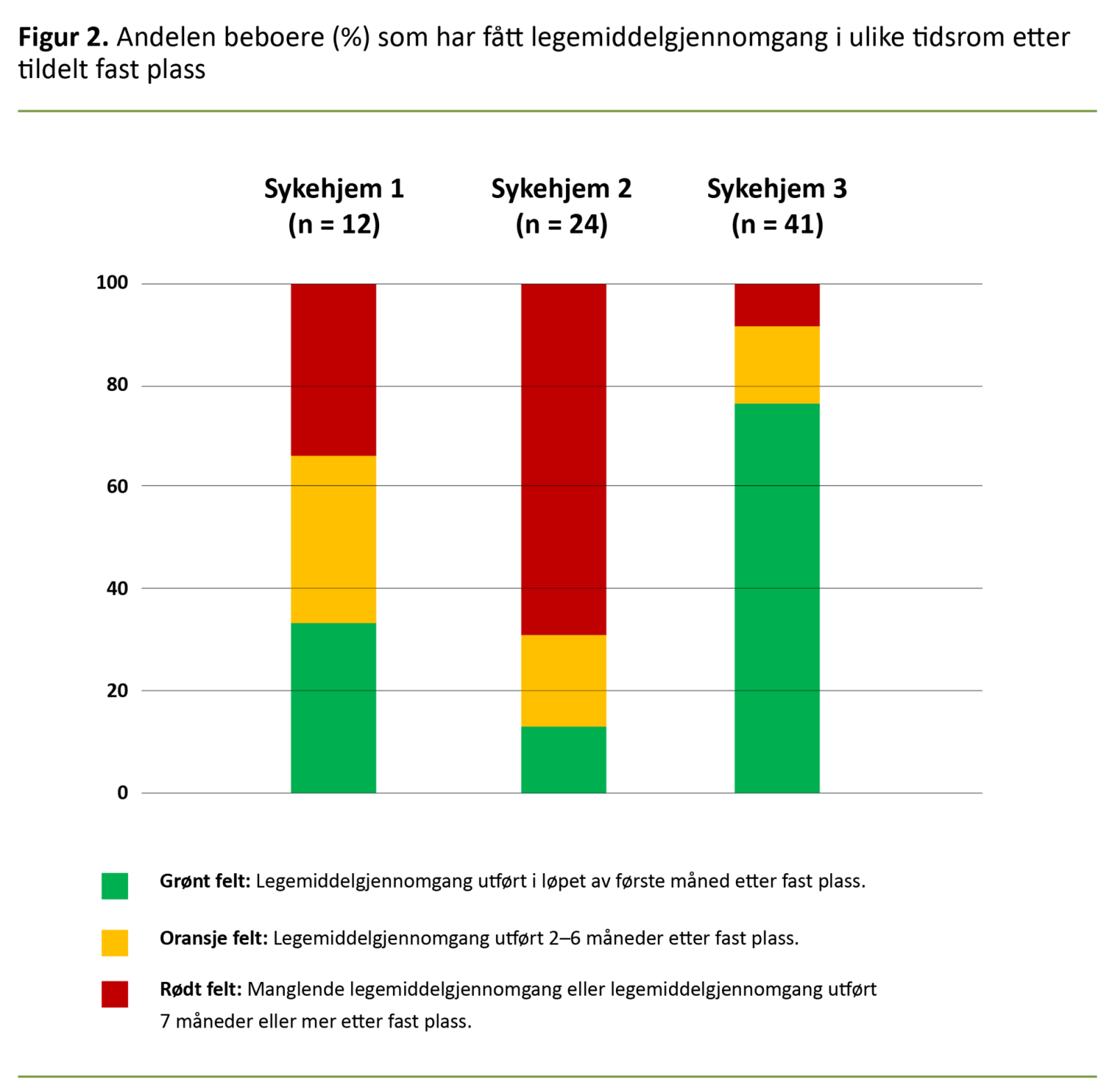 Ved et av sykehjemmene var det utelukkende beboere med innkomsttidspunkt i påske- eller sommerferieavviklingen som ikke hadde fått utført legemiddelgjennomgang i forbindelse med innkomsten. Det kan tyde på utfordringer med å opprettholde rutiner i forbindelse med ferieavvikling.