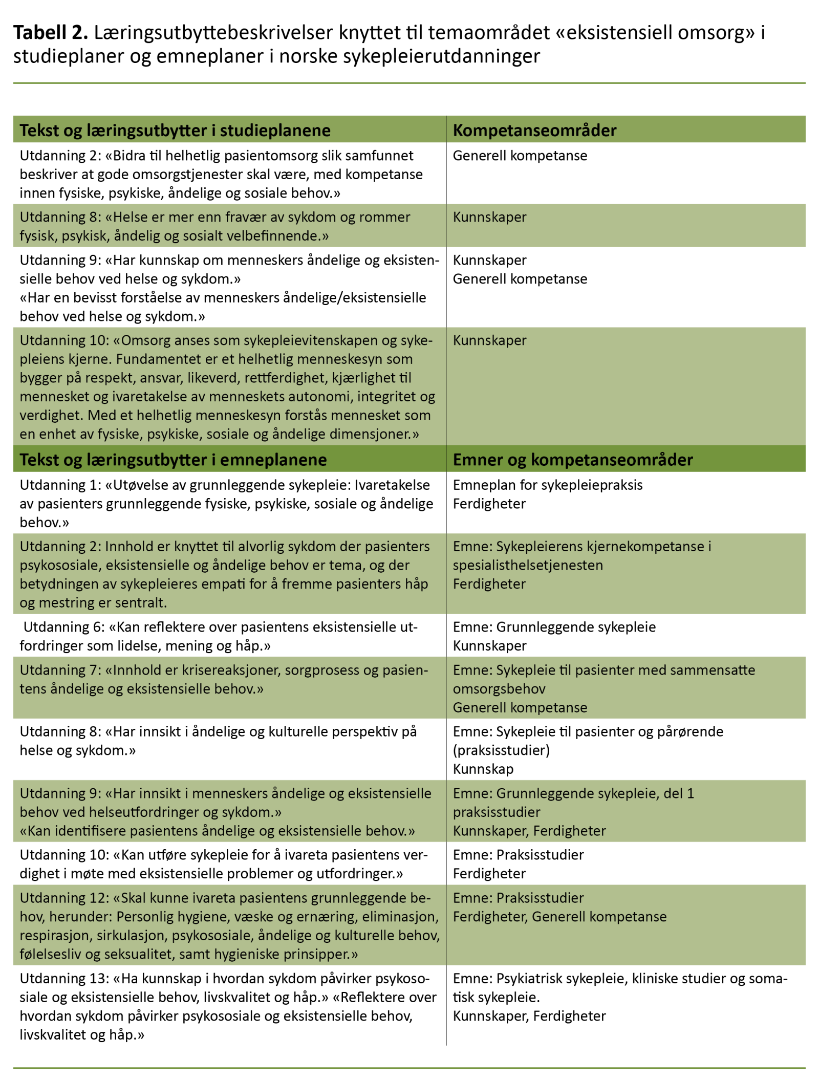 Konklusjon: Eksistensiell omsorg er godt integrert i studieplaner, emneplaner og pensumlister i norsk sykepleierutdanning. Læringsutbyttebeskrivelsene kan likevel bli enda mer presise og etterprøvbare. Kunnskaps- og ferdighetsdimensjonen i kompetansekravene bør også likestilles. Dette er det rom for i de nye nasjonale retningslinjene for sykepleierutdanningen, som gir enda tydeligere signaler om at eksistensiell omsorg skal integreres i utdanningen.