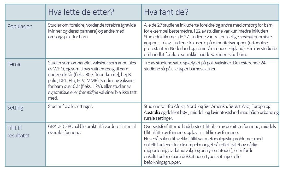 I systematiske oversikter samles og vurderes tilgjengelig forskning. I denne systematiske Cochrane-oversikten var målet å oppsummere kvalitative studier som utforsket foreldres holdninger til og beslutninger om barnevaksiner.
