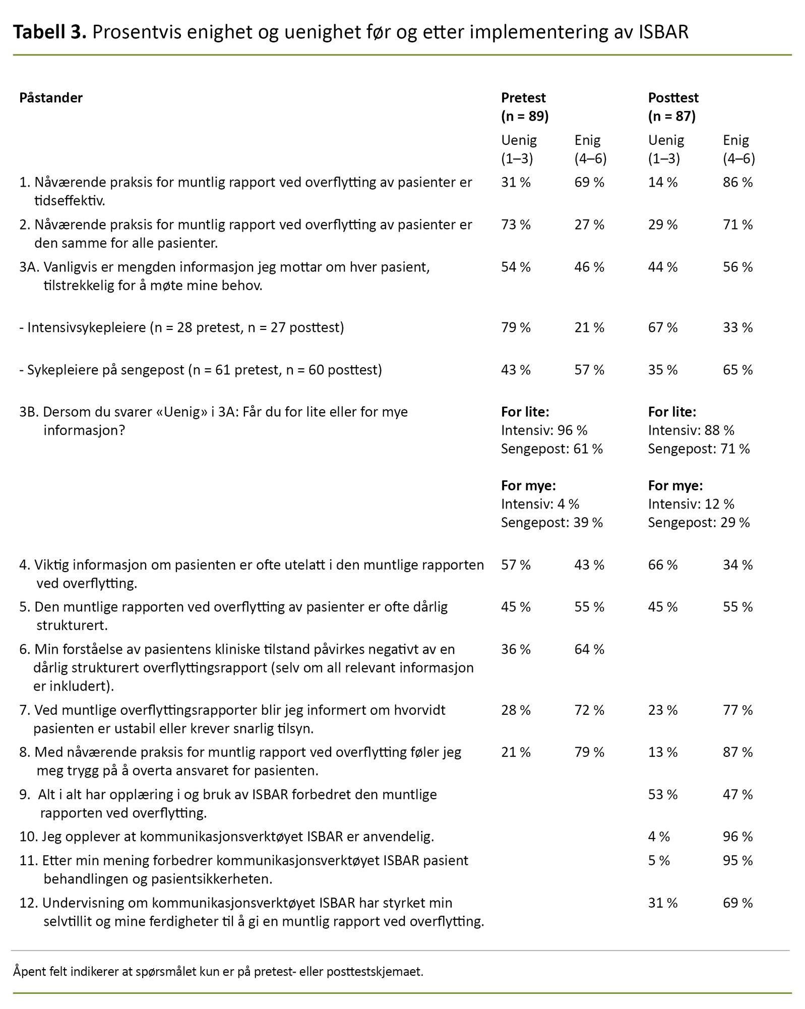 Av alle sykepleierne svarte 96 prosent at kommunikasjonsverktøyet var anvendelig, 95 prosent mente at ISBAR kunne forbedre pasientsikkerheten og pasientbehandlingen, og 69 prosent oppga at undervisning om ISBAR hadde forbedret selvtilliten og ferdighetene til å gi en muntlig rapport. Imidlertid oppga bare 47 prosent at kommunikasjonsverktøyet hadde forbedret den muntlige overflyttingsrapporten (tabell 3).