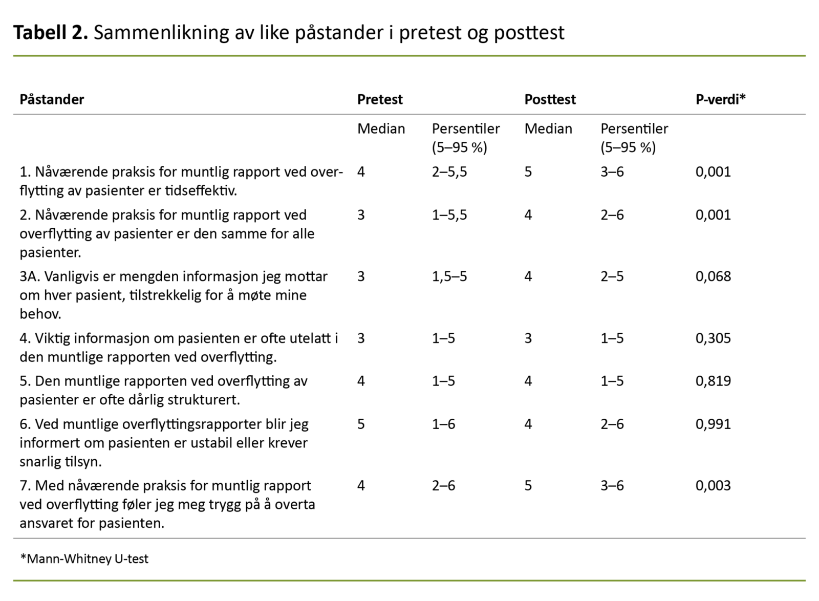 I pretesten var 21 prosent av sykepleierne på intensivavdelingen enig i at de fikk tilstrekkelig informasjon om pasientene ved overflytting sammenliknet med 57 prosent av sykepleierne på sengepost. I posttesten økte dette til 33 prosent på intensivavdelingen og 65 prosent på sengepost.