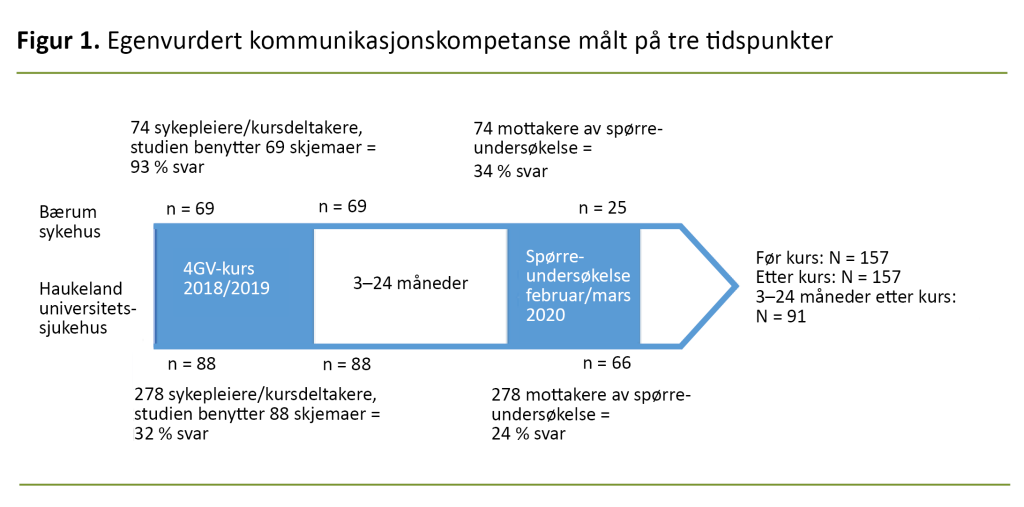 Metode: Undersøkelsen var en deskriptiv tverrsnittsstudie og en oppfølgingsevaluering av egenvurdering av kommunikasjonsstil før og etter et todagers tverrfaglig 4GV-kurs. For å besvare hensikten samlet vi inn data på to måter: Delstudium 1: Evaluering med spørreskjema av egenkompetanse i kommunikasjon før og etter 4GV-kurs fra 157 sykepleiere fra Bærum sykehus og Haukeland universitetssjukehus. Delstudium 2: Et detaljert nettbasert spørreskjema 3–24 måneder etter fullført kommunikasjonskurs i metoden 4GV. Totalt 91 sykepleiere fra de to sykehusene besvarte nettskjemaet.