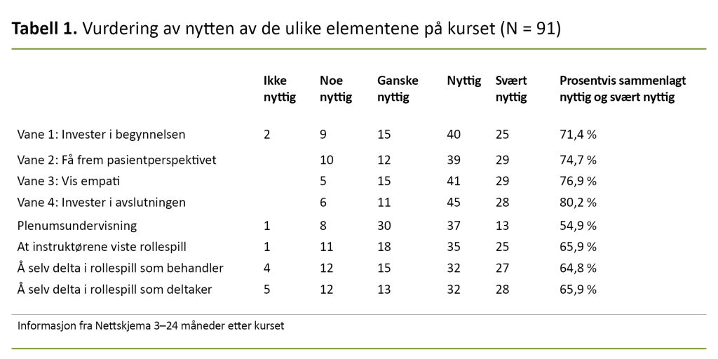Mellom 71,4 og 80,2 prosent av deltakerne vurderte de fire vanene som nyttige eller svært nyttige, mens å investere i avslutningen og få frem pasientperspektivet fikk høyest skår. Videre viste nyttevurderingen av de ulike undervisningselementene at sykepleierne vurderte rollespill som noe mer nyttig enn plenumsundervisning (tabell 1).