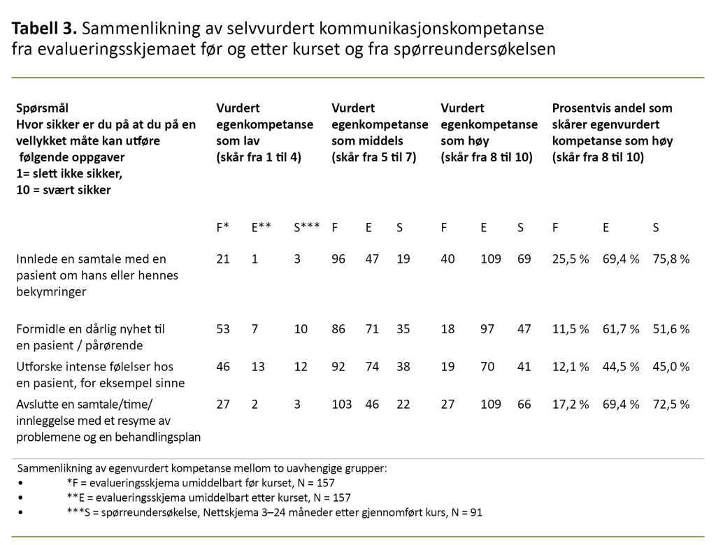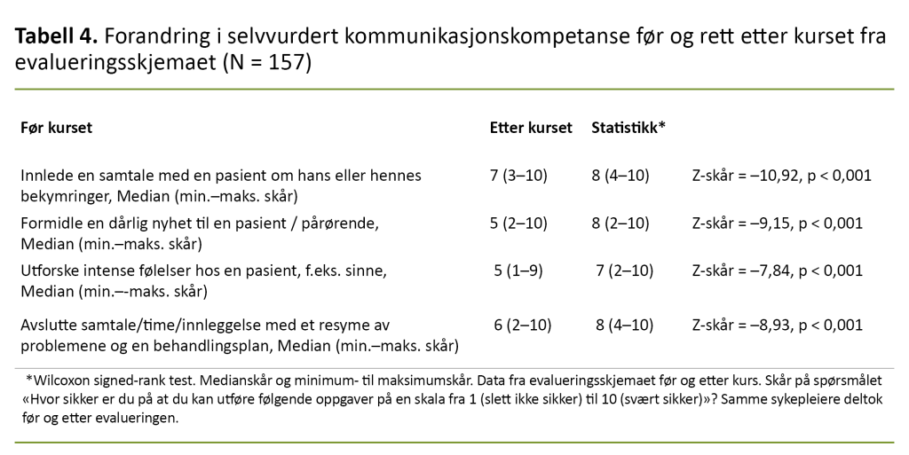 Evaluering av egenkompetanse i kommunikasjonsferdigheter ble betydelig bedre etter gjennomgått 4GV-kurs (tabell 3 og 4). Etter å ha fullført 4GV-kurset rapporterte deltakerne at de fikk høyere kompetanse i å innlede en samtale med en pasient om hans eller hennes bekymringer, bedre ferdigheter i formidling av en dårlig nyhet til en pasient eller pårørende, bedre evne til å utforske intense følelser hos en pasient og kompetanse i behandlingsplan.