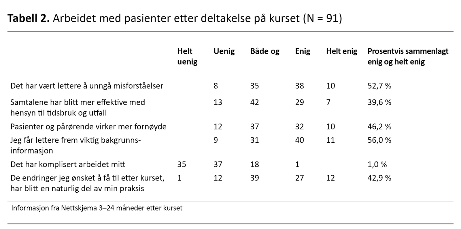 Som vist i tabell 2 rapporterte over halvparten av deltakerne at det var lettere å unngå misforståelser i arbeidet med pasienter 3–24 måneder etter å ha deltatt på 4GV-kurs. Det var lettere å få frem viktig bakgrunnsinformasjon, og i tillegg virket pasienter og pårørende mer fornøyd. Kun én respondent mente at 4GV kompliserte praksis (tabell 2).