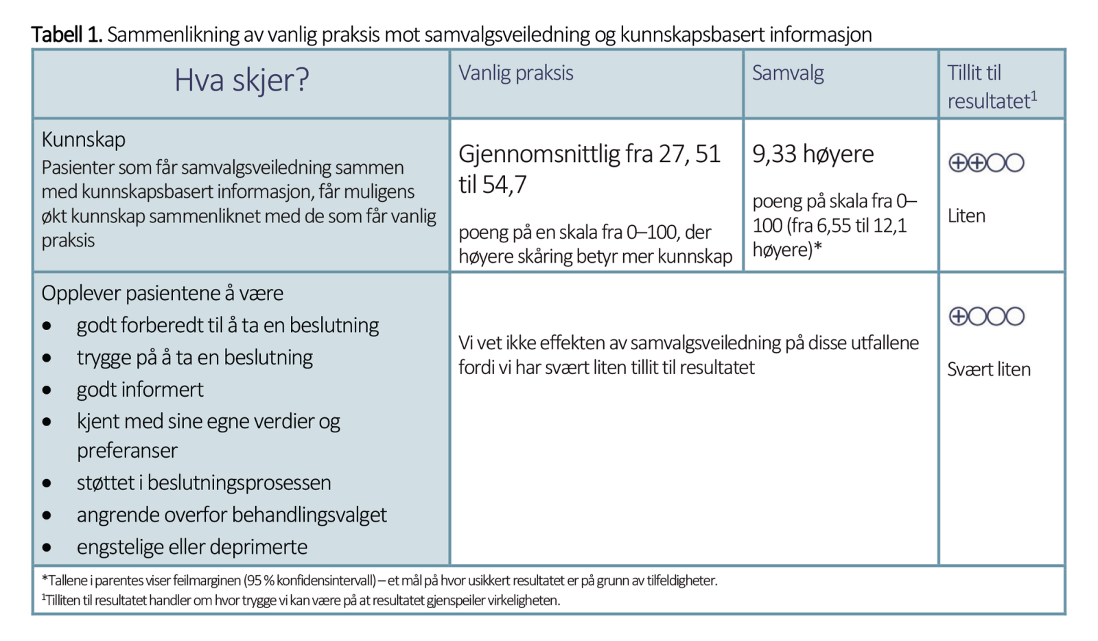 Når helsepersonell gir samvalgsveiledning og kunnskapsbasert informasjon, får muligens pasientene økt kunnskap om behandlingens fordeler og ulemper.