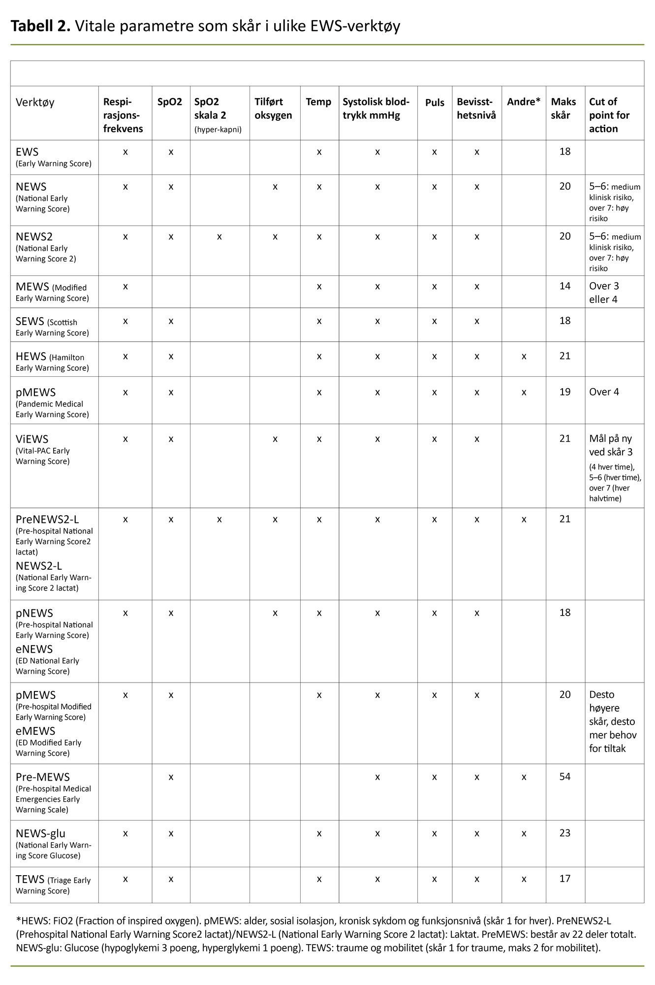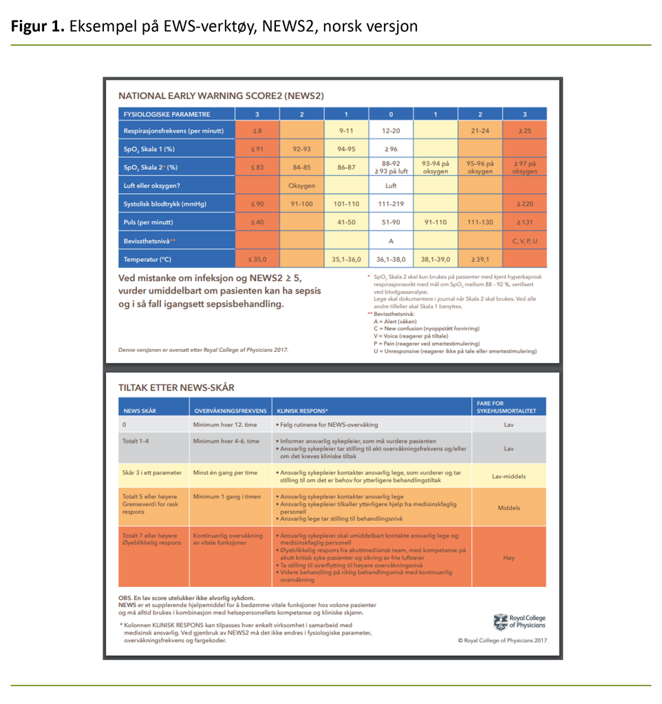 I Norge er kanskje National Early Warning Score (NEWS/NEWS2) (figur 1) og Modified Early Warning Score (MEWS) de mest kjente og benyttede verktøyene for tidlig oppdagelse av forverret tilstand. På engelsk brukes fellesbetegnelsen Early Warning Score (EWS).