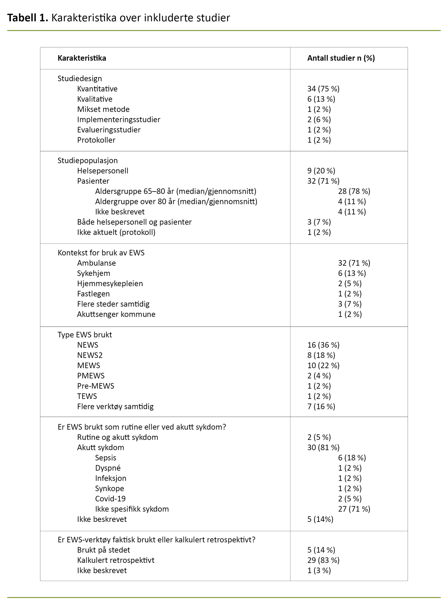 Vi identifiserte totalt 14 ulike EWS-verktøy, og mer enn halvparten av artiklene omhandlet NEWS eller NEWS2 (figur 3 og tabell 2). Kun et fåtall av studiene omhandlet faktisk bruk av verktøy (n = 5). I de fleste tilfellene var data hentet ut retrospektivt (24, 25, 27, 30, 31, 33–35, 42–62).