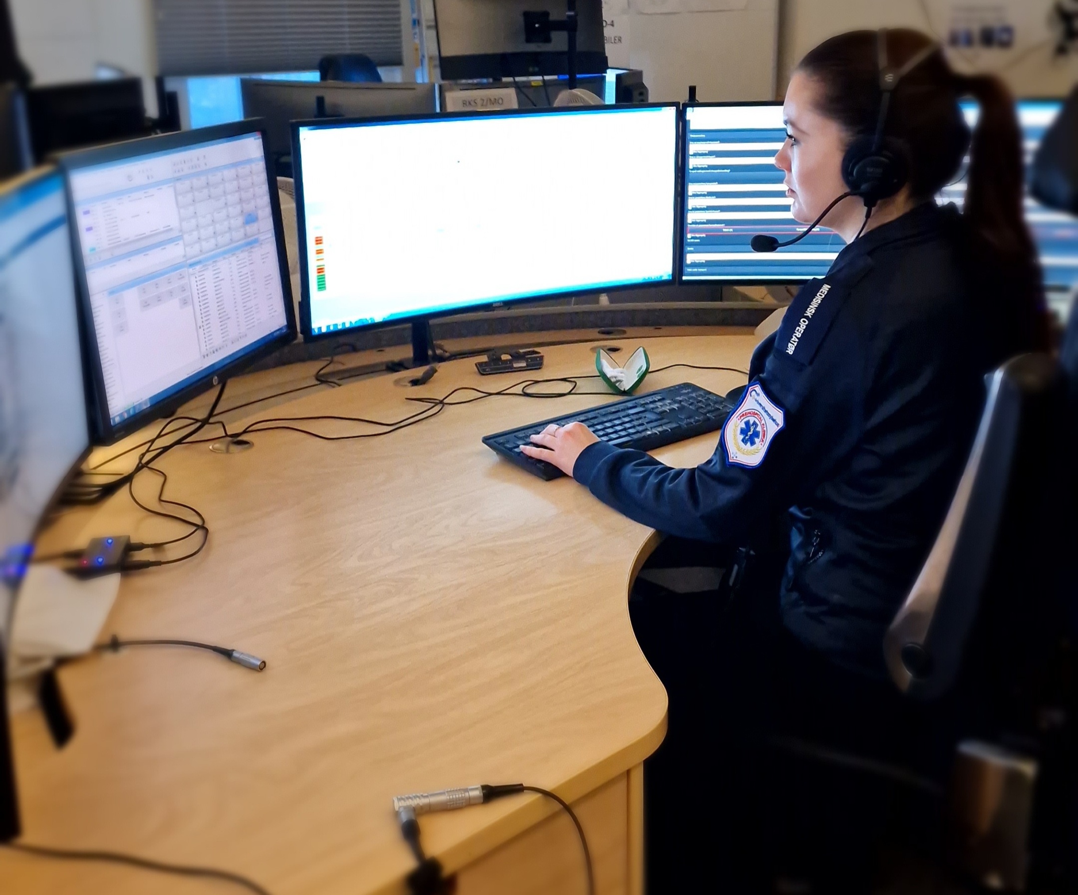 Bildet viser en AMK-sykepleier på AMK-sentralen. Hun sitter foran fire store skjermer og svarer på 113-samtaler