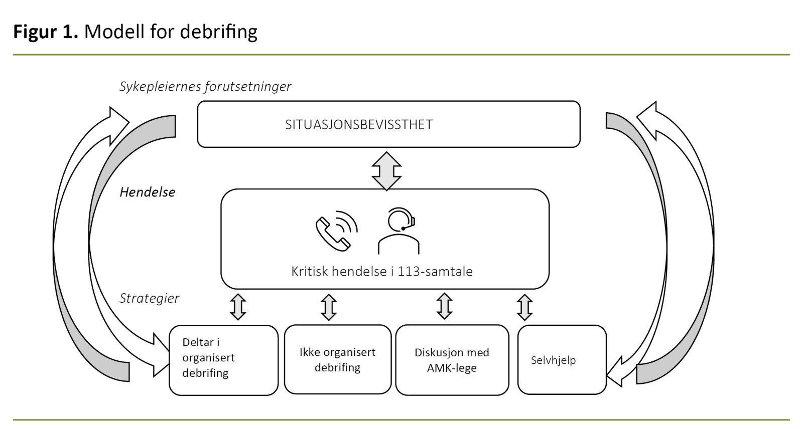 Resultat: Analysen viser at sykepleiernes «situasjonsbevissthet» har betydning for hvordan de håndterer kritiske hendelser og debrifer i ettertid. Sykepleierne i denne studien valgte ulike strategier for debrifing, avhengig av omstendigheter som blant annet tid, tilbud om debrifing og opplevd behov. Sykepleierne debrifer primært på egen hånd («selvhjelp») gjennom å ta korte pauser, ved hjelp av tilbakemeldinger og spontane samtaler med kolleger og med egne forberedelser for å håndtere fremtidige hendelser. Det fremkom også situasjoner der sykepleierne søkte støtte i faglige gjennomganger hos AMK-legene, som kjente situasjonen, og annet personell. Organisert debrifing var ikke en fast rutine, men informantene var positivt innstilt når det ble tilbudt. Noen av informantene hadde ikke deltatt i en organisert debrifing.