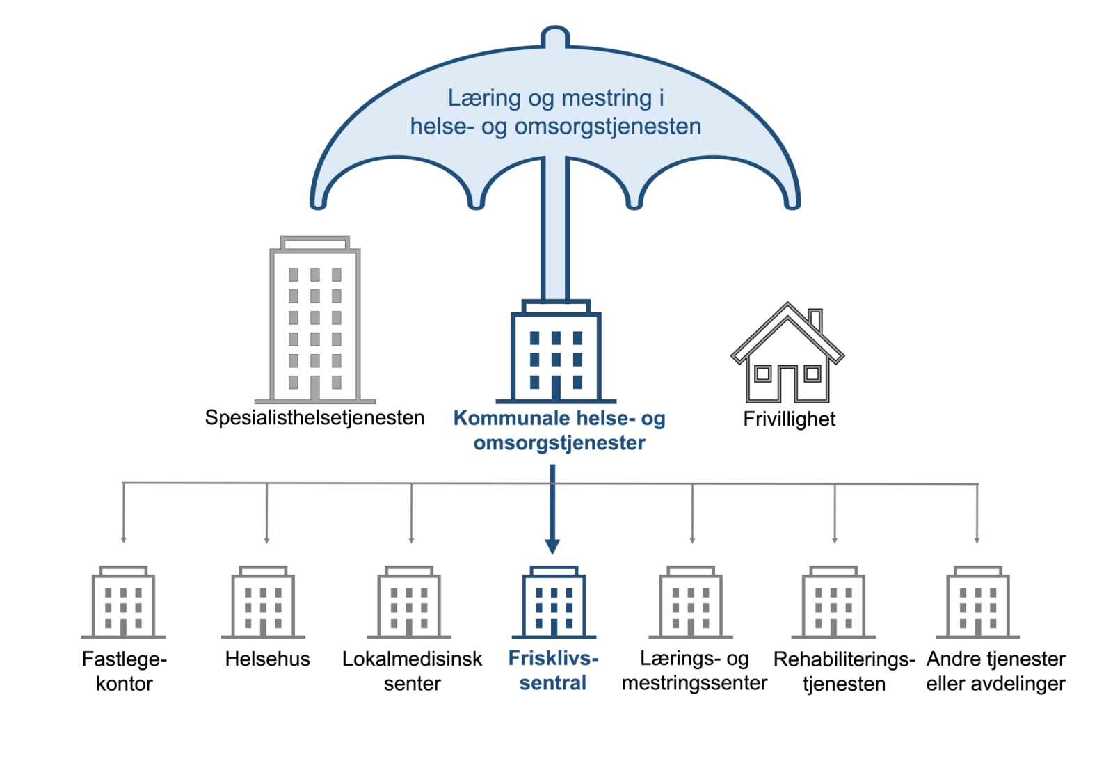 Figuren er en forenklet framstilling av frisklivssentralen som én av flere arenaer for læring og mestring i helse- og omsorgstjenesten i kommunen. Det er flere arenaer enn de nevnte og ulike kombinasjoner av de nevnte kan også utgjøre arenaer.